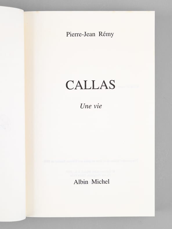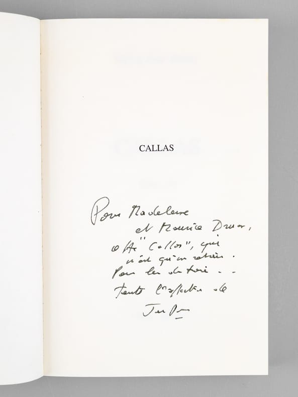 Bel envoi de l'auteur pour "Madeleine et Maurice Druon, ce "La Callas", qui n'est qu'un retiré. Pour les distraire... Toute l'affection de Jean Pierre" pour cet ouvrage de provenance prestigieuse : de la bibliothèque du grand écrivain Maurice Druon, Secrétaire Perpétuel de l'Académie Française de 1985 à 1999, auteur des "Rois Maudits" et co-auteur avec son oncle Joseph Kessel du "Chant des Partisans".
