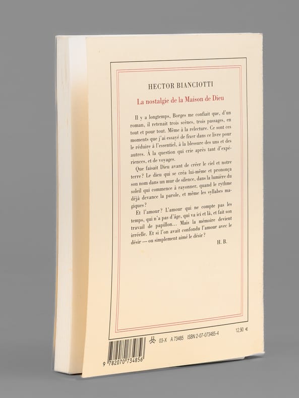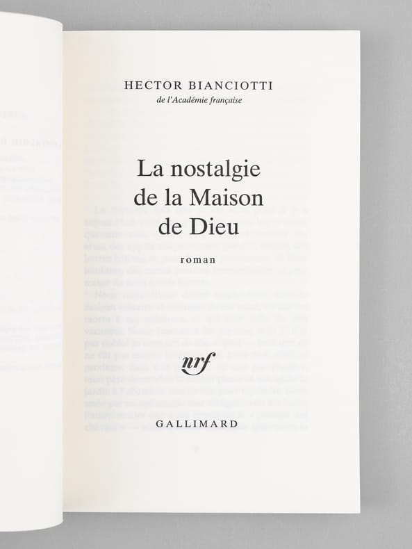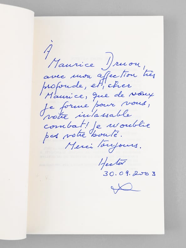Bel envoi d'Hector Biancotti "à Maurice Druon avec mon affection très profonde, et cher Maurice, que de voeux je forme pour vous, votre inlassable combat ! Je n'oublie pas votre bonté. Merci toujours." Bon état (qq. rouss. sur tranche sup.) pour cet exemplaire de superbe provenance : de la bibliothèque du grand écrivain Maurice Druon, Secrétaire Perpétuel de l'Académie Française de 1985 à 1999, qui, conformément à son habitude, a plié l'angle des feuillets contenant des passages de l'ouvrage qui avaient retenu plus particulièrement son attention.