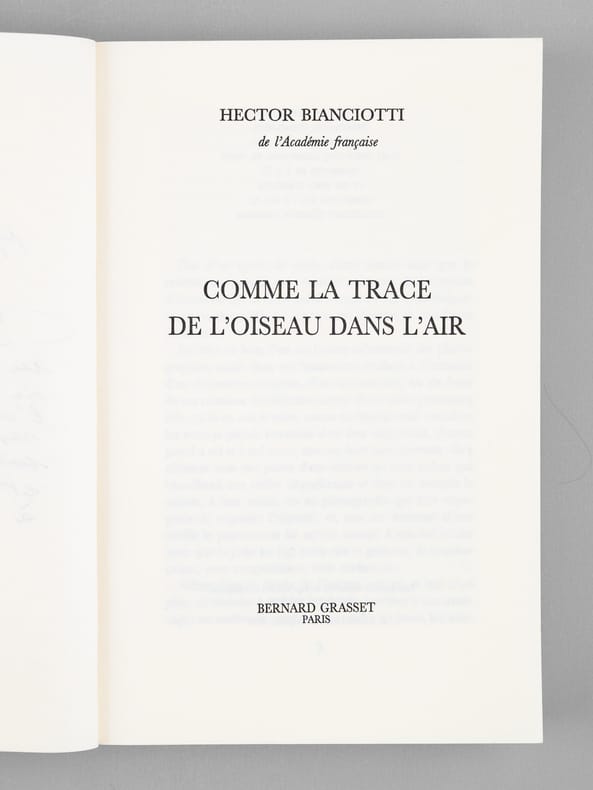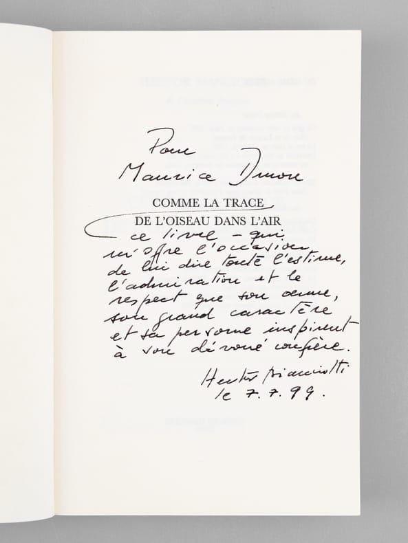 Bel envoi d'Hector Biancotti "Pour Maurice Druon ce livre - qui m'offre l'occasion de lui dire toute l'estime, l'admiration et le respect que son oeuvre, son grand caractère et sa personne inspirent à son dévoué confrère." Bon état (qq. rouss. sur tranche sup.) pour cet exemplaire de superbe provenance : de la bibliothèque du grand écrivain Maurice Druon, Secrétaire Perpétuel de l'Académie Française de 1985 à 1999, qui, conformément à son habitude, a plié l'angle des feuillets contenant des passages de l'ouvrage qui avaient retenu plus particulièrement son attention, et a signalé à l'encre en marge quelques passages.