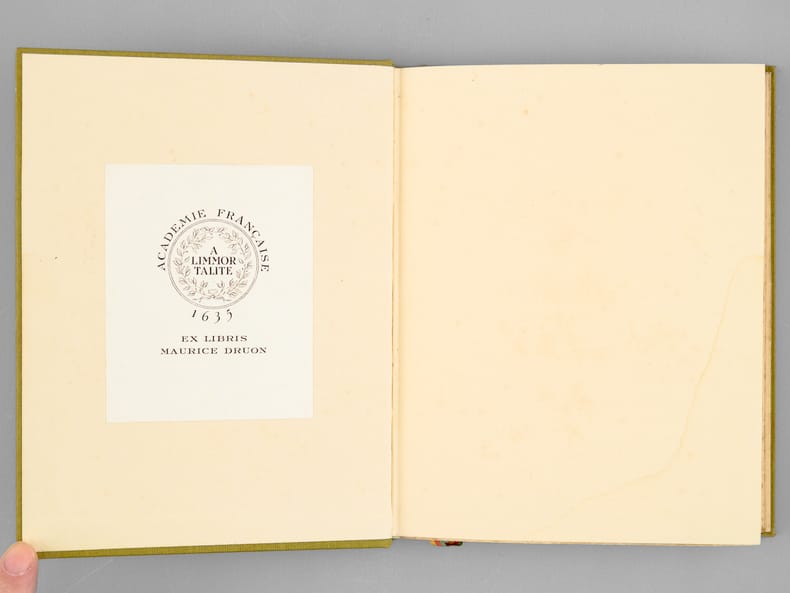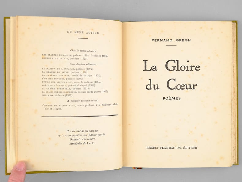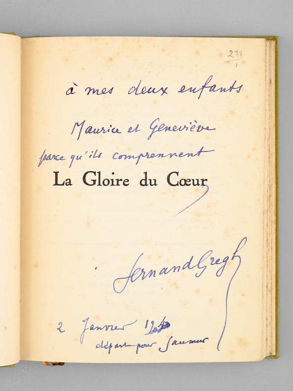 Envoi de Fernand Gregh "à mes deux enfants, Maurice et Geneviève parce qu'ils comprennent "La Gloire du Coeur". 2 Janvier 1940 départ pour Saumur". Bon exemplaire venant de la bibliothèque du grand écrivain Maurice Druon, Secrétaire Perpétuel de l'Académie Française de 1985 à 1999. Maurice avait publié en 1937 le texte d'une Conférence prononcée au Lycée Michelet au cours d'une matinée en l'honneur du poète, intitulé "Fernand Gregh et son oeuvre" ; il épousera en 1939 la fille de Fernand Gregh, Geneviève. Avec en garde le bel ex-libris de Maurice Druon.