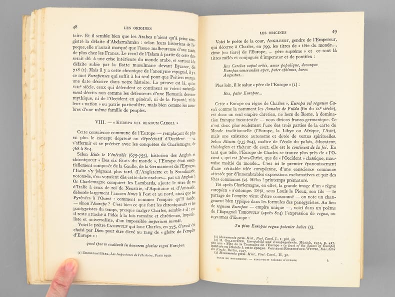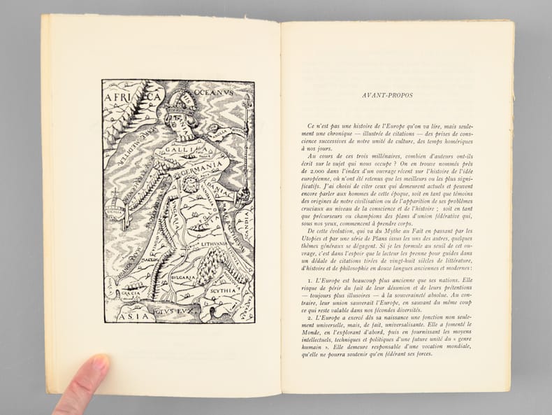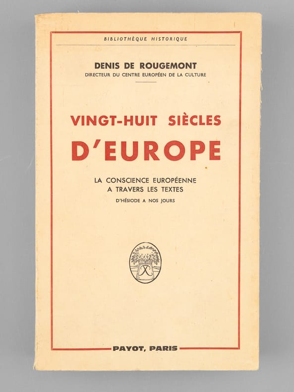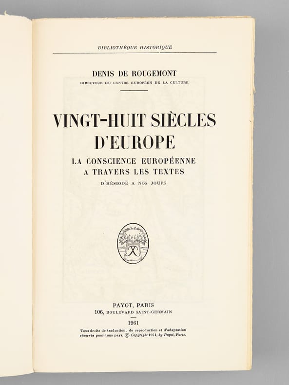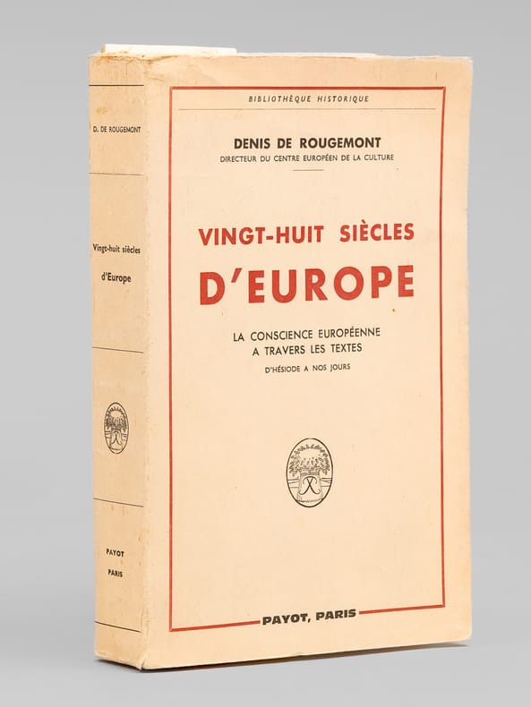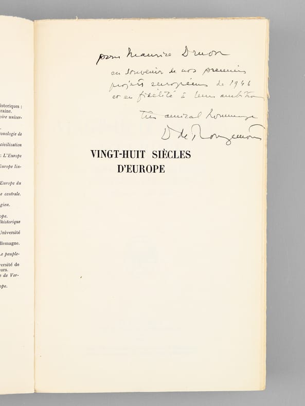 Très bel envoi de Denis de Rougemont : "Pour Maurice Druon, en souvenir de nos premiers projets européens de 1946 et en fidélité à leurs ambitions. Très amical hommage". Bon état pour cet exemplaire de superbe provenance : de la bibliothèque du grand écrivain Maurice Druon, Secrétaire Perpétuel de l'Académie Française de 1985 à 1999. Conformément à son habitude, Maurice Druon a signalé à l'encre 2 passages ayant particulièrement retenu son attention.