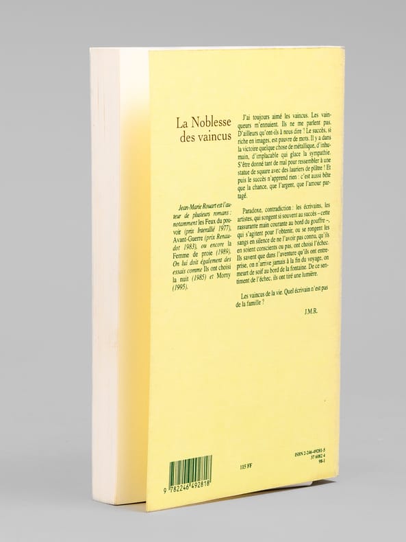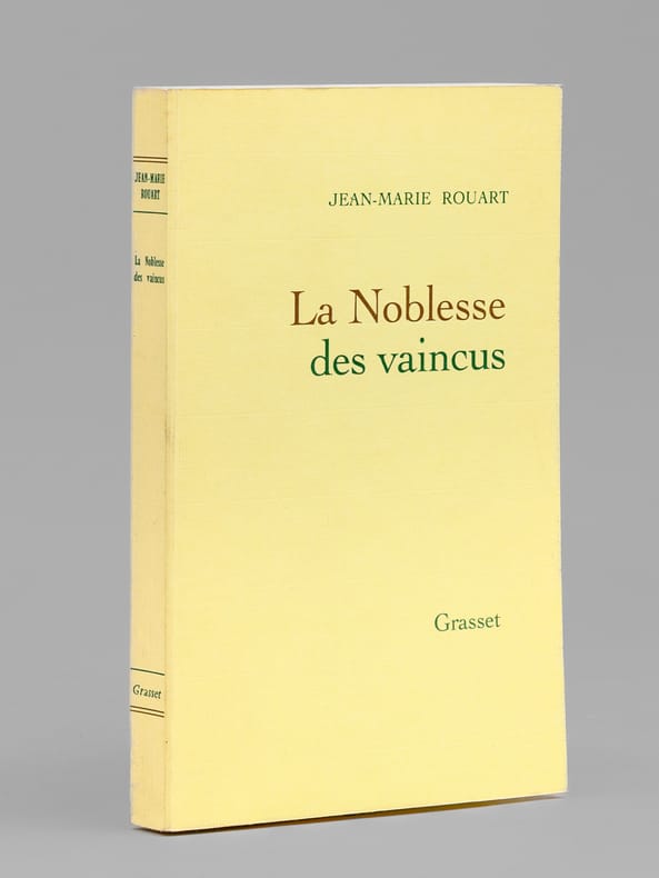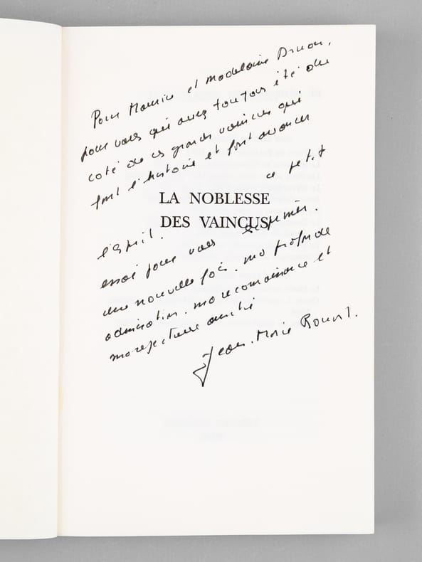 Superbe envoi de Jean Marie-Rouart : "Pour Maurice et Madeleine Druon, pour vous qui avez toujours été du côté de ces grands vaincus qui font l'histoire et font avancer l'esprit. Ce petit essai pour vous exprimer, une nouvelle fois, ma profonde admiration [etc ... ] ". Bon état (lég. rouss. sur tranche sup.) pour cet exemplaire de superbe provenance : de la bibliothèque du grand écrivain Maurice Druon, Secrétaire Perpétuel de l'Académie Française de 1985 à 1999. Conformément à son habitude, Maurice Druon a replié l'angle de 2 feuillets dont la lecture avait plus particulièrement retenu son attention.