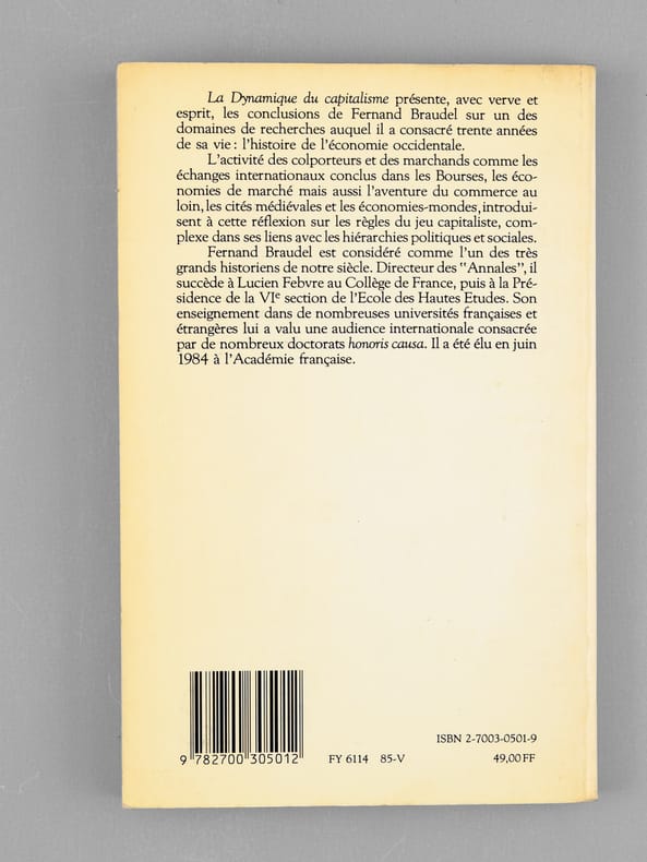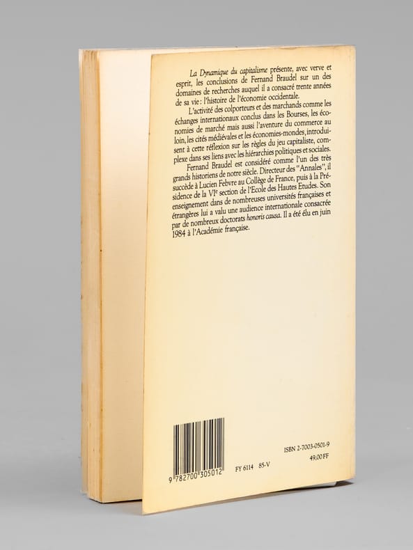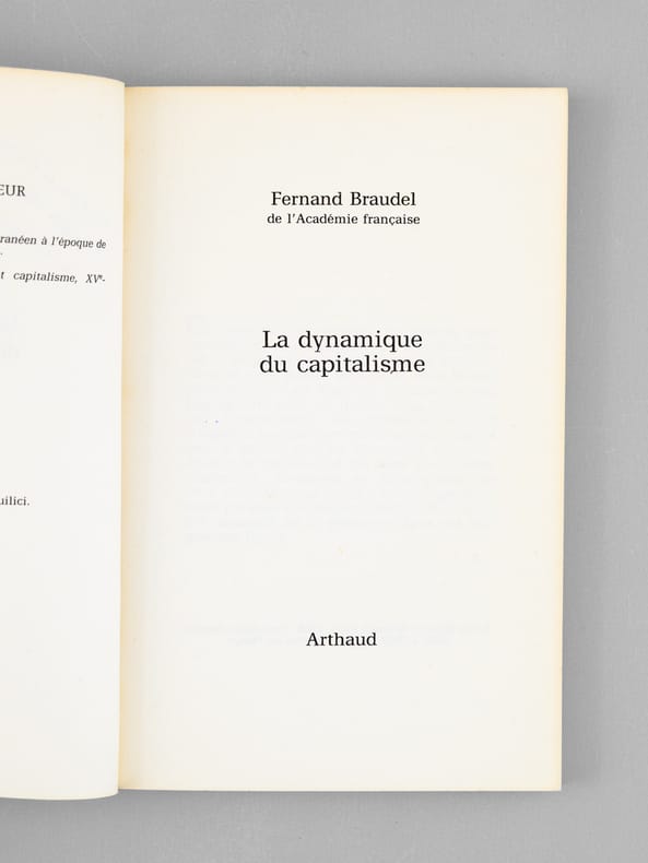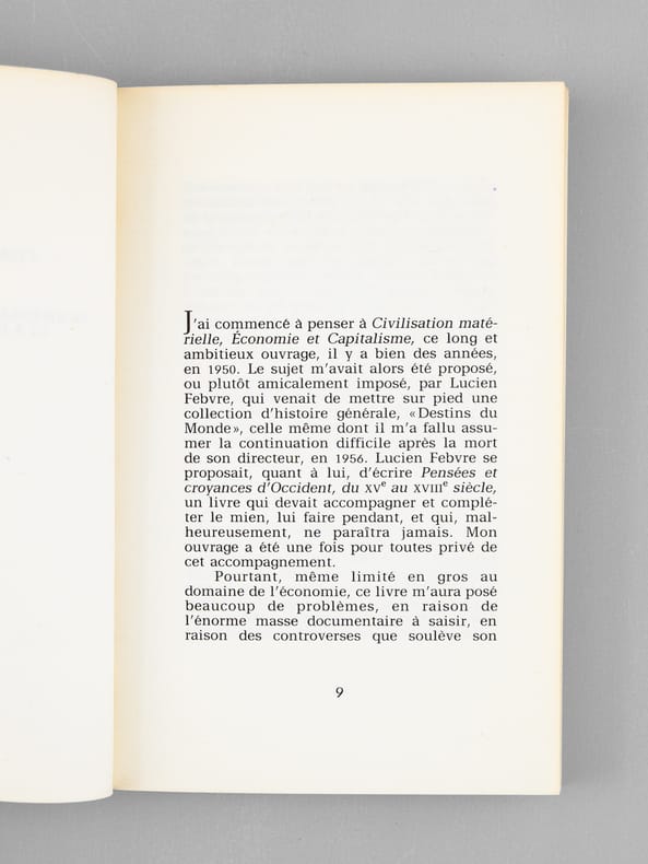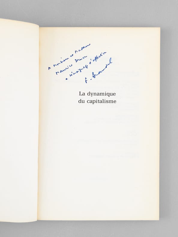 Envoi de Fernand Braudel "A Monsieur et Madame Druon, en témoignage d'affection". Superbe provenance pour cet important ouvrage dédicacé par Fernand Braudel : de la bibliothèque du grand écrivain Maurice Druon, Secrétaire Perpétuel de l'Académie Française de 1985 à 1999.