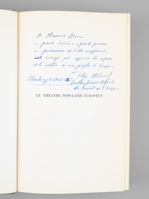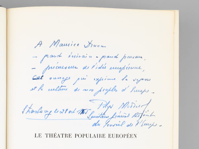 Envoi de Polys Modinos, Secrétaire Général Adjoint du Conseil de l'Europe "A Maurice Druon, grand écrivain, grand penseur, précurseur de l'idée européenne, cet ouvrage qui exprime la sagesse et la culture de nos peuples d'Europe". Bon état (reliure très lég. frottée avec petite tache au second plat) pour ce rare exemplaire dédicacé, de superbe provenance : de la bibliothèque du grand écrivain Maurice Druon, Secrétaire Perpétuel de l'Académie Française de 1985 à 1999.