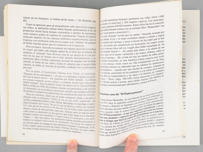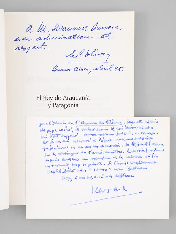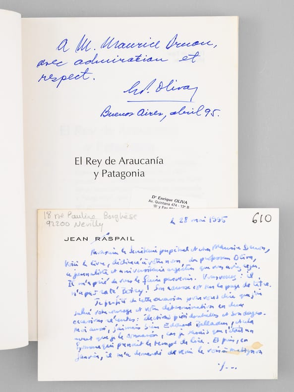 Remarquable exemplaire dédicacé par le Dr. Enrique Oliva "A M. Maurice Druon avec admiration et respect", et enrichi d'une longue carte autographe signé de Jean Raspail : "Monsieur le Sécrétaire perpétuel et cher Maurice Druon, Voici le livre, dédicacé à votre nom, du professeur Oliva, le journaliste et universitaire argentin que vous aviez reçu. Il m'a prié de vous le faire parvenir. Vous verrez : il n'a pas raté Boiry ! Son adresse est sur la page de titre. Je profite de cette occasion pour vous dire que j'ai salué votre courage et votre détermination en deux occasions récentes : élections présidentielles et sondages. Moi aussi, j'aimais bien Edouard Balladur, et cela avant que je le connaisse, car je savais que c'était un homme qui prenait le temps de lire. Et puis, en janvier, il m'a demandé de venir le voir à Matignon pour l'éclairer sur "l'Anneau du Pêcheur". Dans cette histoire de Pape caché, il voulait savoir ce qui était vrai et ce qui était supposé. Nous nous sommes fort bien entendus... Et je me suis retrouvé à Pâques avec une surprise que je n'avais en aucun cas demandée : la Légion d'Honneur sur le contingent du Premier Ministre. Le dossier traînait depuis deux ans au ministère de la Culture où l'on me trouvait trop royaliste. Je l'avais complètement oublié. Voilà mon "roman" avec Balladur...". Dans les remerciements de l'auteur imprimés en début d'ouvrage on peut lire : "Mi reconocimiento a cuantus contribuyeron a que este libro fuera escrito, en especial a : el escritor frances Jean Raspail ; Maurice Druon, Secretario Perpetuo de la Academia Francesa [ ... ]". Maurice Druon était l'arrière-petit-fils par sa mère d'Antoine-Hippolyte Cros, troisième « roi d’Araucanie et de Patagonie ». Bon état (reliure très lég. frottée avec petite tache au second plat) pour ce rare exemplaire dédicacé par l'auteur et enrichi d'une superbe carte autographe signée de Jean Raspail.