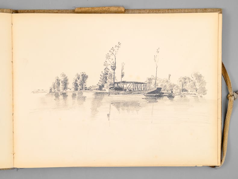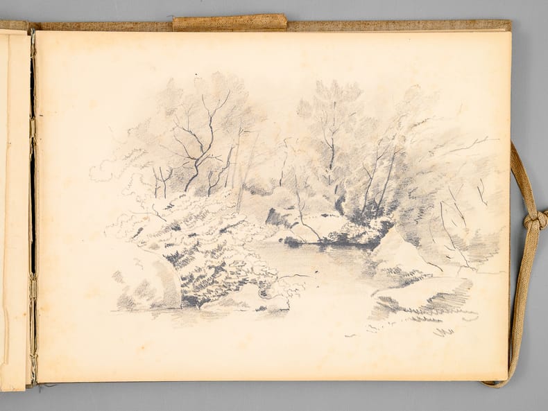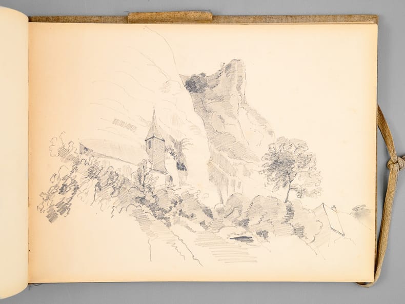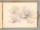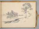 Carnet de dessins recueillant 26 croquis et dessins au crayon, d'une assez bonne main (pour les paysages). Etat très satisfaisant (reliure un peu faible avec restauration à l'adhésif en garde, un feuillet débroché). Le carnet provient de la bibliothèque de Maurice Druon.