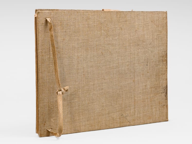 1 carnet format petit in-4 (32 x 24,5 cm) reliure pleine toile grège, étiquette imprimée "E. Normand, 32 & 34 passage du Havre", s.d., 50 feuillets dont 26 ornés d'un dessin