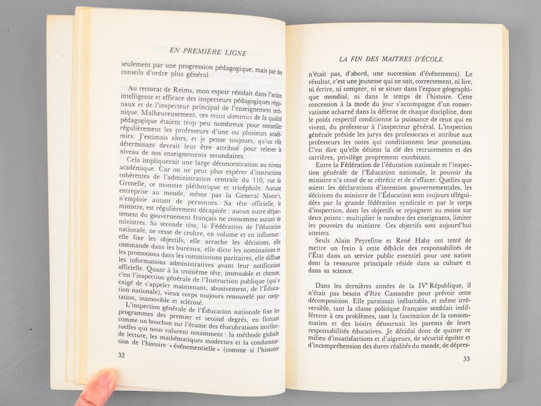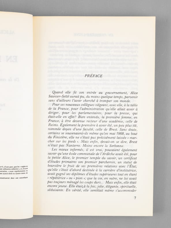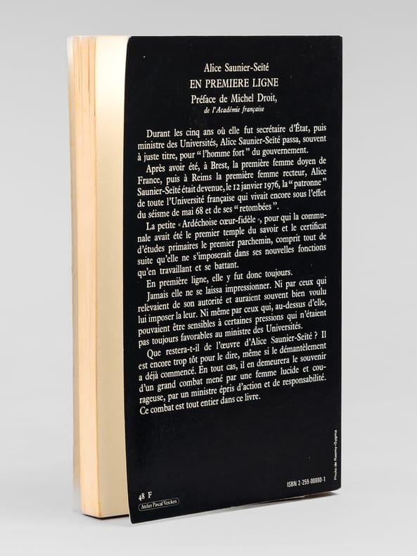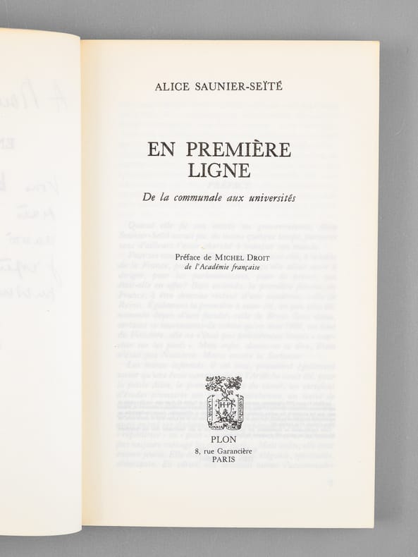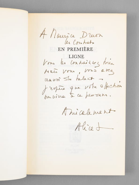 Bel envoi d'Alice Saunier-Seïté "A Maurice Druon, les combats en "Première ligne" vous les connaissez bien mais vous, vous avez aussi du talent. J'espère que votre affection survivra à ce pensum." Bon état pour cet exemplaire de superbe provenance : de la bibliothèque du grand écrivain Maurice Druon, Secrétaire Perpétuel de l'Académie Française de 1985 à 1999, et qui fut ministre des Affaires culturelles en 1973-1974. Conformément à son habitude, a plié l'angle des feuillets contenant des passages de l'ouvrage qui avaient retenu plus particulièrement son attention, et a signalé à l'encre en marge quelques passages.