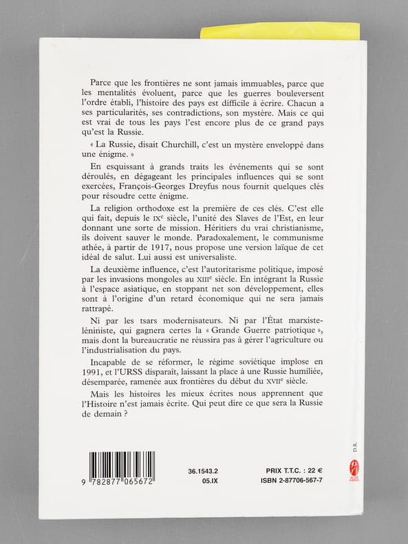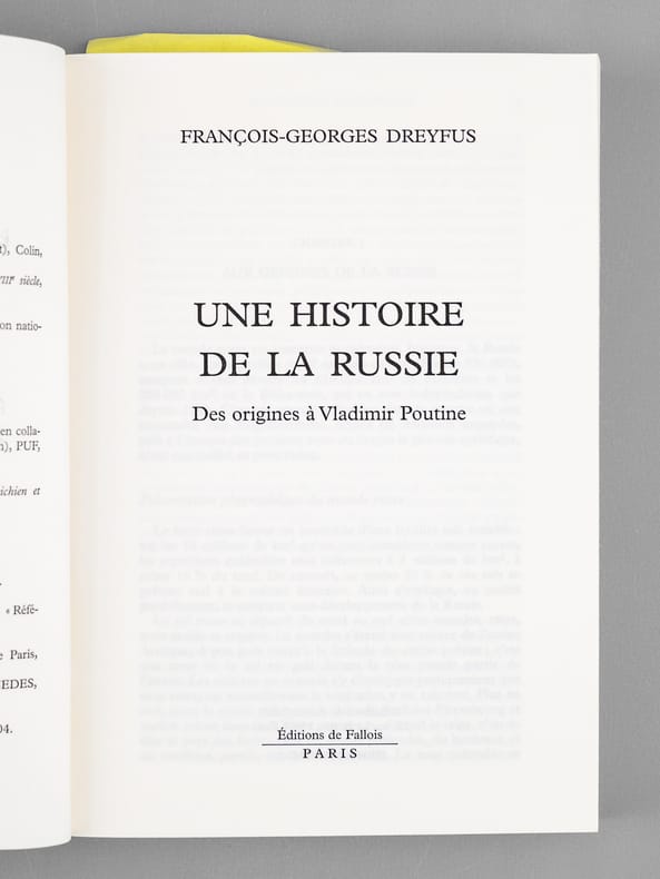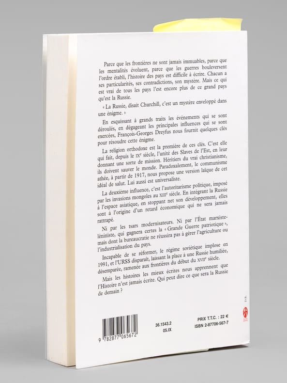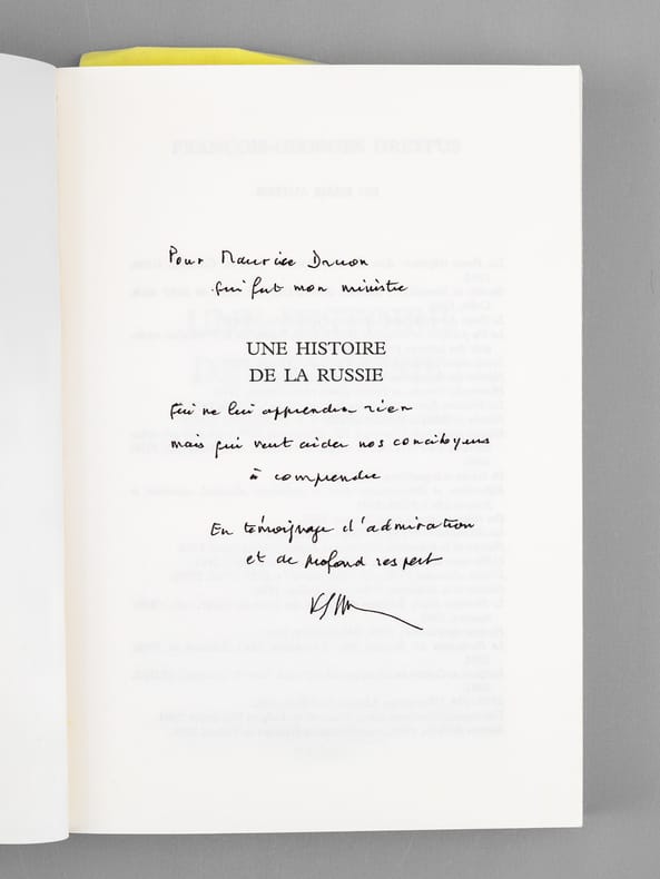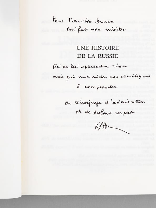 Bel envoi de l'auteur : "Pour Maurice Druon qui fut mon ministre. Une Histoire de la Russie qui ne lui apprendra rien mais qui veut aider nos concitoyens à comprendre [ ... ]". Bon état pour cet exemplaire de superbe provenance : de la bibliothèque du grand écrivain Maurice Druon, Secrétaire Perpétuel de l'Académie Française de 1985 à 1999. Ministre des Affaires culturelles en 1973-1974, Maurice Druon accueillera Vladimir Poutine à l'Abbaye de Faize en 2003.