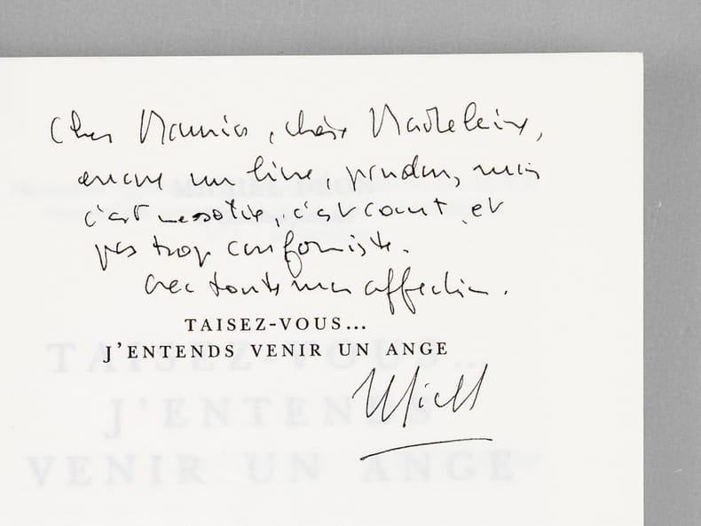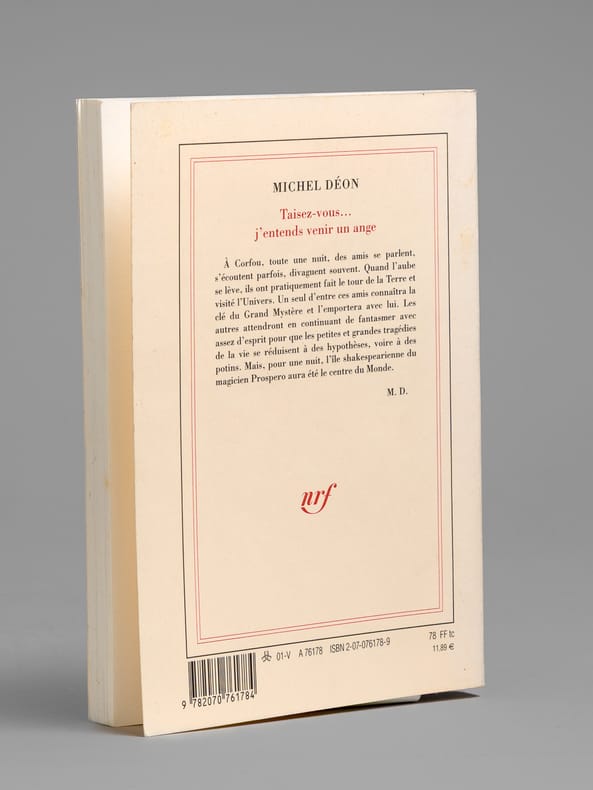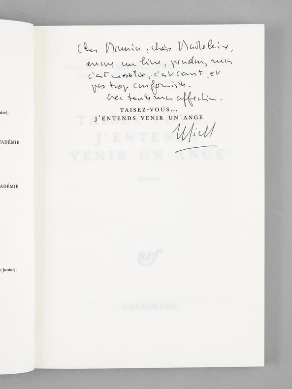 Bel envoi de Michel Déon : "Cher Maurice, chère Madeleine, encore un livre, [ ... ] , mais c'est une sotie, c'est court, et pas trop conformiste. Avec toute mon affection". Bon état pour cet exemplaire de superbe provenance : de la bibliothèque du grand écrivain Maurice Druon, Secrétaire Perpétuel de l'Académie Française de 1985 à 1999.