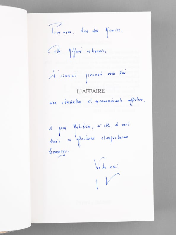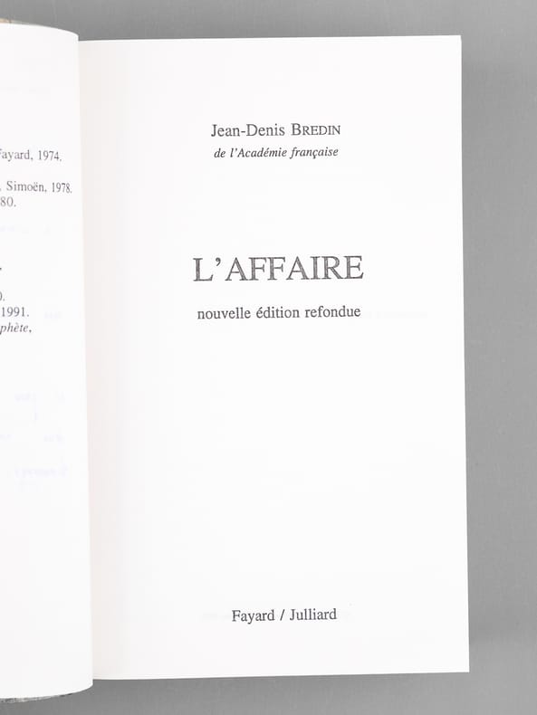 Bel envoi de Jean-Denis Bredin : "Pour vous, bien cher Maurice, cette Affaire retrouvée, J'aimerai pouvoir vous dire mon admirative et reconnaissante affection [... ]" ! Bon état pour cet exemplaire de superbe provenance : de la bibliothèque du grand écrivain Maurice Druon, Secrétaire Perpétuel de l'Académie Française de 1985 à 1999 et immortel auteur avec son oncle Joseph Kessel du texte du "Chant des Partisans"