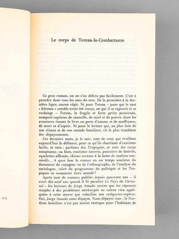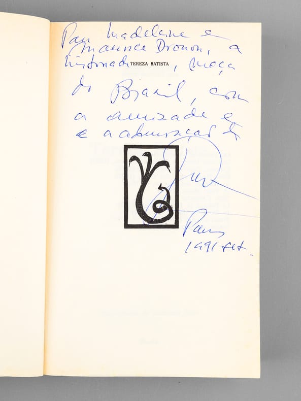 Bel envoi de l'écrivain brésilien Jorge Amado "Para Madeleine e Maurice Druon [... ]" Bon état pour cet exemplaire de superbe provenance : de la bibliothèque du grand écrivain et auteur des "Rois Maudits", Maurice Druon, Secrétaire Perpétuel de l'Académie Française de 1985 à 1999 et immortel auteur avec son oncle Joseph Kessel du texte du "Chant des Partisans".