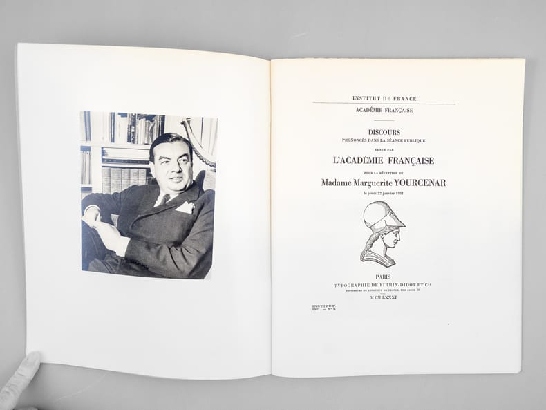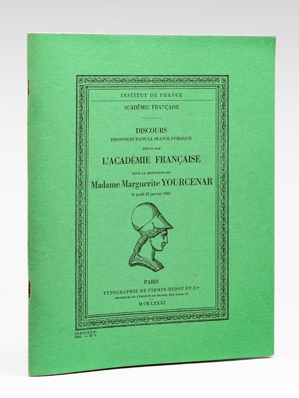 1 vol. in-4 agrafé, Institut de France, Académie Française, Typographie de Firmin-Didot et Cie, Paris, 1981, 39 pp. Rappel du titre complet : Discours prononcés dans la séance publique tenue par l'Académie Française pour la réception de Madame Marguerite Yourcenar le jeudi 22 janvier 1981 [ Livre dédicacé par Jean d'Ormesson à Maurice Druon ] [ Contient : Discours de réception de Madame Marguerite Yourcenar à l'Académie Française - Réponse de Monsieur Jean d'Ormesson ]