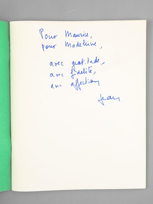 Très remarquable exemplaire dédicacé par Jean d'Ormesson "Pour Maurice, pour Madeleine, avec gratitude, avec fidélité, avec affection, Jean". Bon état (rouille sur les agrafes, très bon état par ailleurs) pour ce remarquable exemplaire du tirage de l'Institut, dédicacé par Jean d'Ormesson, de superbe provenance : de la bibliothèque du grand écrivain et auteur des "Rois Maudits", Maurice Druon, futur Secrétaire Perpétuel de l'Académie Française de 1985 à 1999 et immortel auteur avec son oncle Joseph Kessel du texte du "Chant des Partisans". Le discours de Marguerite Yourcenar porte sur son prédécesseur Roger Caillois