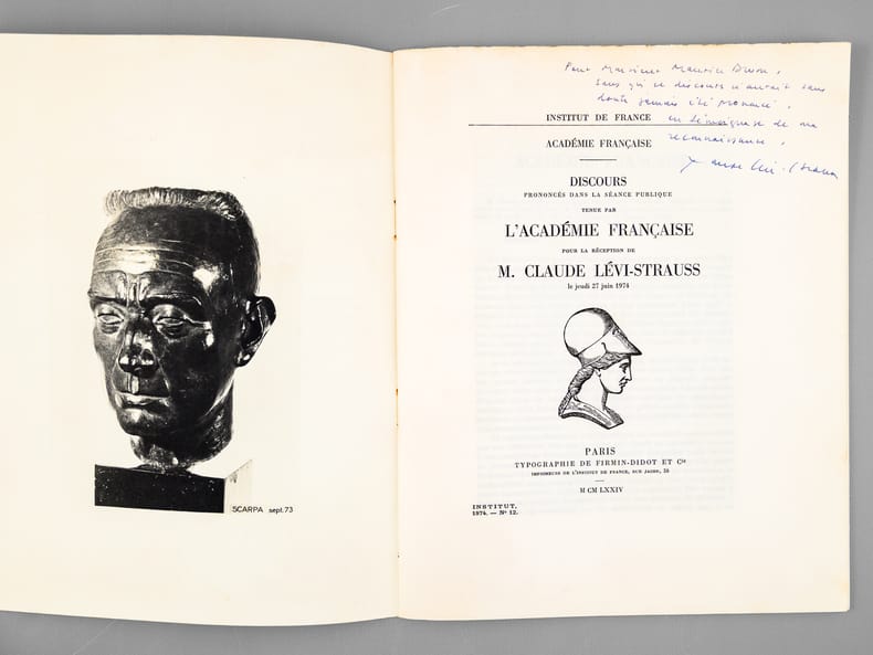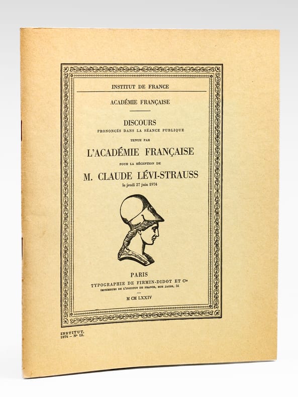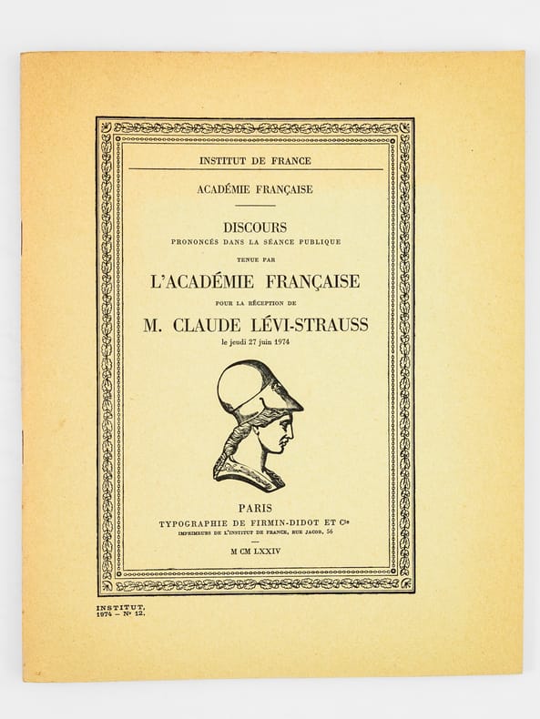 1 vol. in-4 agrafé, Institut de France, Académie Française, Typographie de Firmin-Didot et Cie, Paris, 1974, 38 pp. Rappel du titre complet :Discours prononcés dans la séance publique tenue par l'Académie Française pour la réception de M. Claude Lévi-Strauss le jeudi 27 juin 1974 [ Livre dédicacé par Jean d'Ormesson à Maurice Druon ] [ Contient : Discours de réception de Claude Lévi-Strauss à l'Académie Française - Réponse de Roger Caillois ]