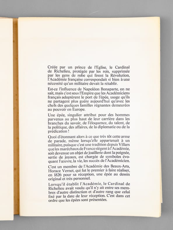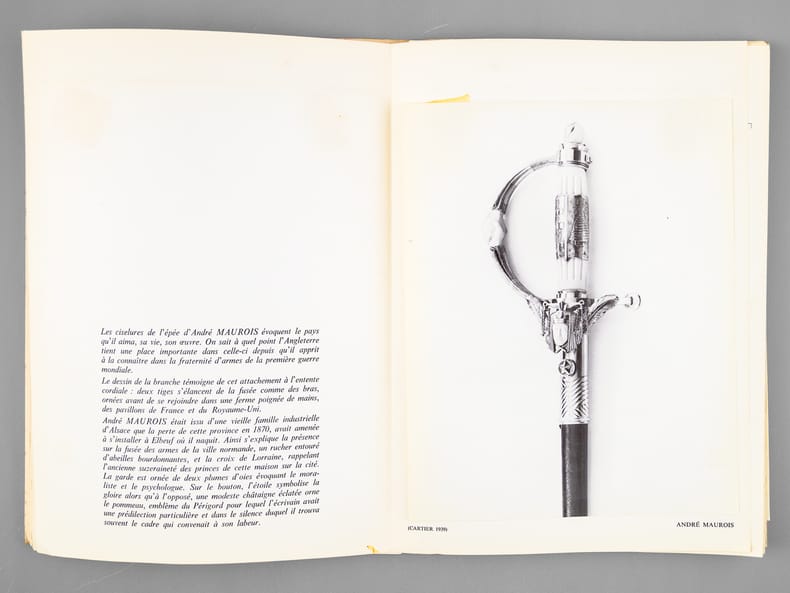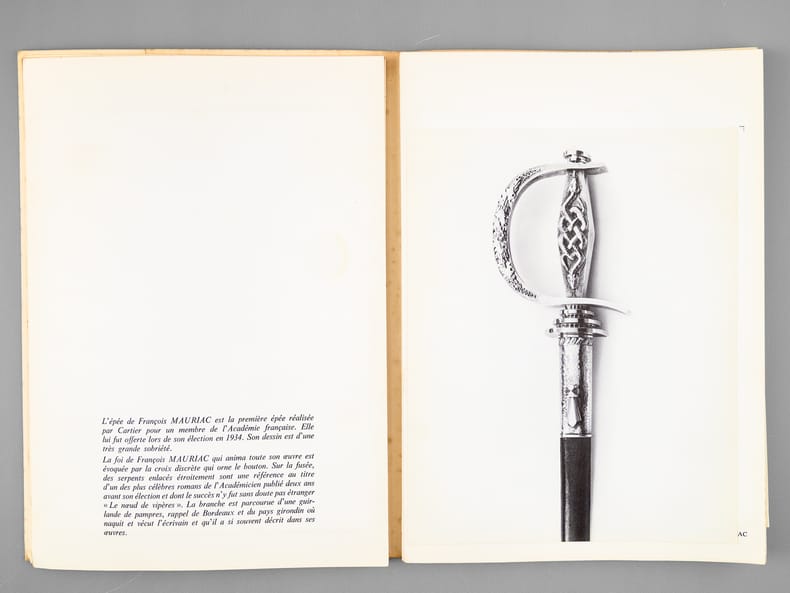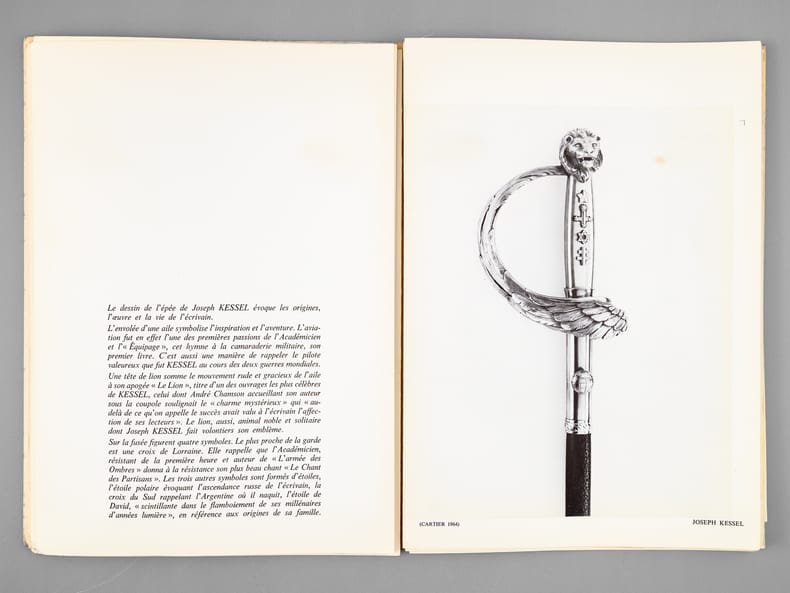 Exemplaire n° 22, 1 vol. in-4 en feuillets sous chemise, Ouvrage réalisé par Cartier en hommage à l'Insitut de France et à l'Académie Française, décembre 1972, 23 feuillets dont 20 photographies d'épées et de bâton de maréchal