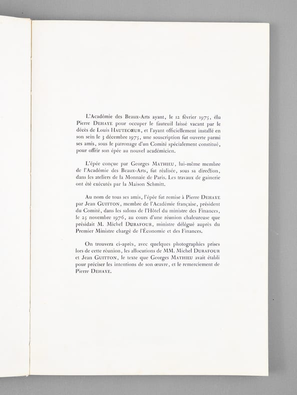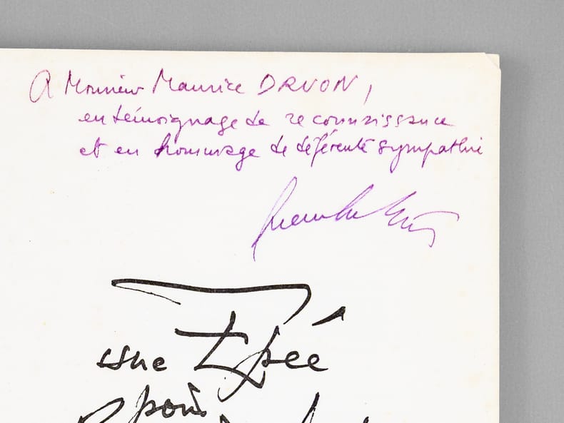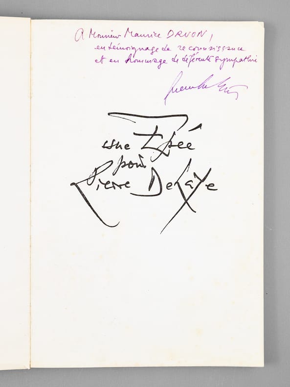 Envoi de Pierre Dehaye "A Monsieur Maurice Druon, en témoignage de reconnaissance et en hommage de déférente sympathie". Bon état (couv. lég. frottée, qq. rouss.) pour cet exemplaire de provenance remarquable : de la bibliothèque du grand écrivain et auteur des "Rois Maudits", Maurice Druon, futur Secrétaire Perpétuel de l'Académie Française de 1985 à 1999 et immortel auteur avec son oncle Joseph Kessel du texte du "Chant des Partisans".