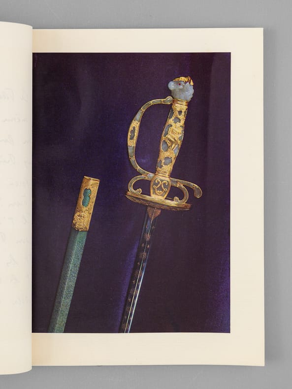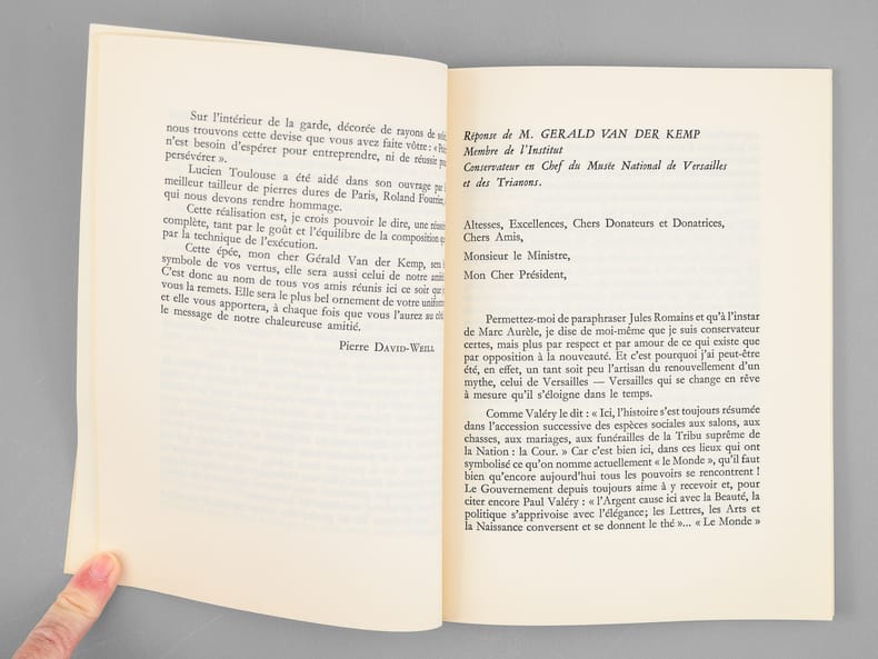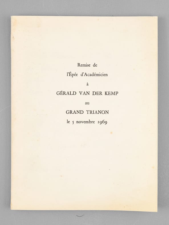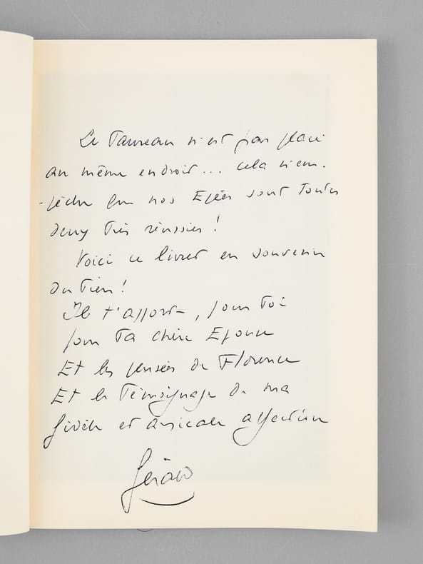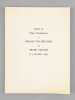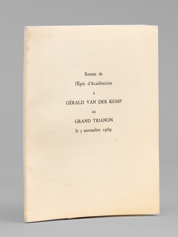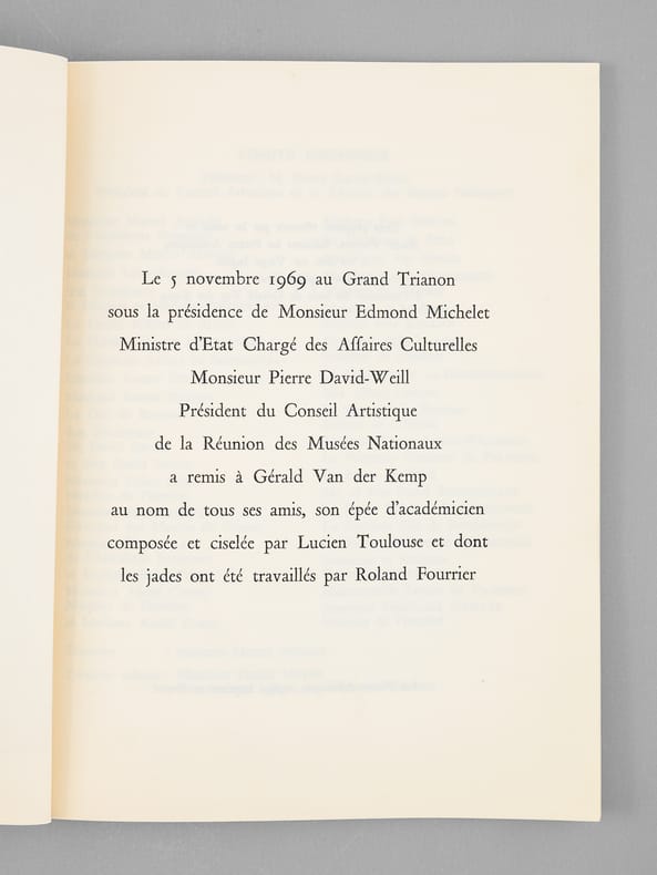 Bel envoi du conservateur Gérald van der Kemp "Le Taureau n'est pas placé au même endroit... Cela n'empêche que nos épées sont toutes deux très réussies ! Voici ce livret en souvenir du tien ! [ ... ]". Bon état (lég. cintré) pour cet exemplaire de provenance remarquable : de la bibliothèque du grand écrivain et auteur des "Rois Maudits", Maurice Druon, Secrétaire Perpétuel de l'Académie Française de 1985 à 1999 et immortel auteur avec son oncle Joseph Kessel du texte du "Chant des Partisans".
