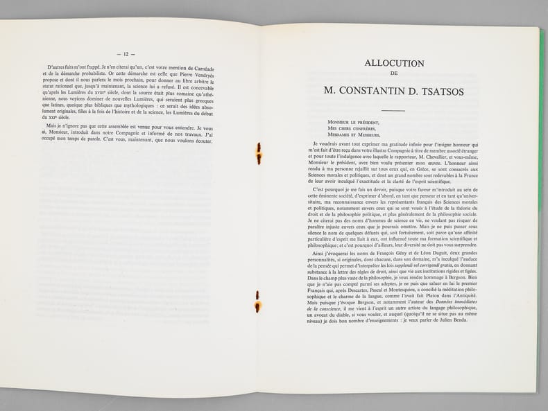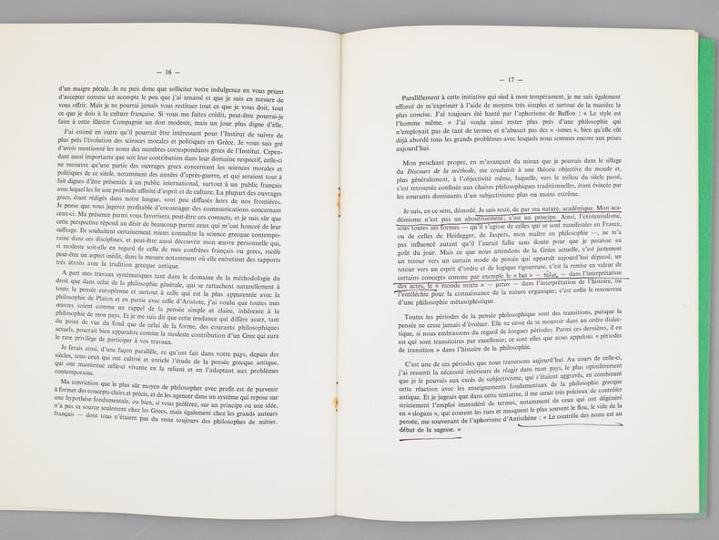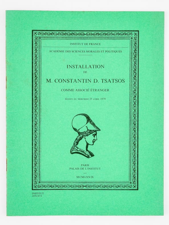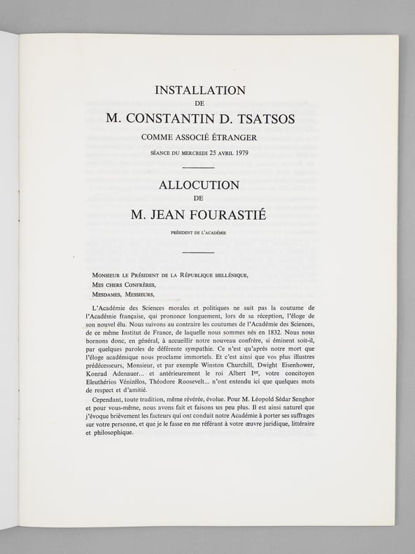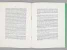Bon état (rouille sur les agrafes). Avec les allocutions de Jean Fourastié et de Konstantin Tsatsos. Superbe provenance (bien qu'aucune marque ne la précise sur le document) : de la bibliothèque du grand écrivain et auteur des "Rois Maudits", Maurice Druon, futur Secrétaire Perpétuel de l'Académie Française de 1985 à 1999 et immortel auteur avec son oncle Joseph Kessel du texte du "Chant des Partisans", qui a souligné de sa main quelques passages.