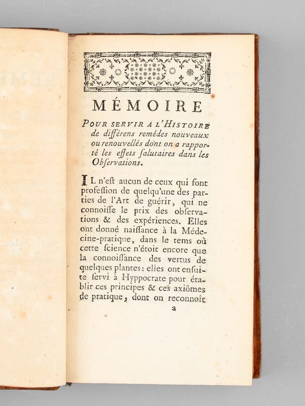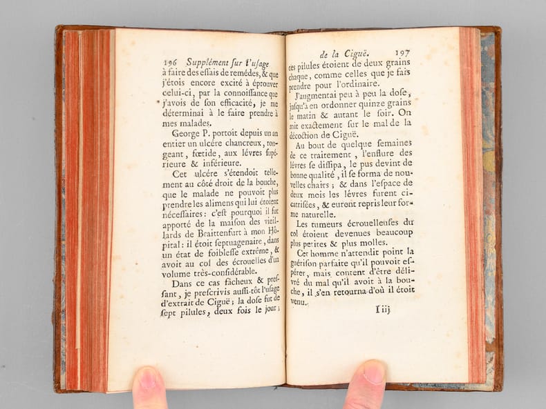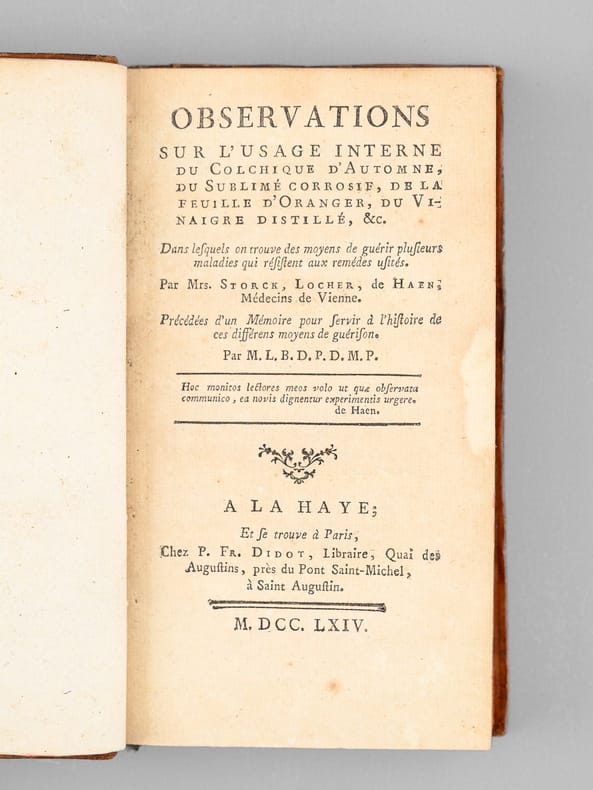 Par Mrs Storck, Locher, de Haen, Médecins de Vienne. Précédées d'un Mémoire pour servir à l'histoire de ces différens moyens de guérison par M.L.B.D.P.D.M.P., 1 vol. in-12 reliure de l'époque plein veau marbré, Chez P. Fr. Didot, A La Haye, Paris, 1764, 2 ff., LXXI pp., 2 ff., 254 pp. et 1 f.