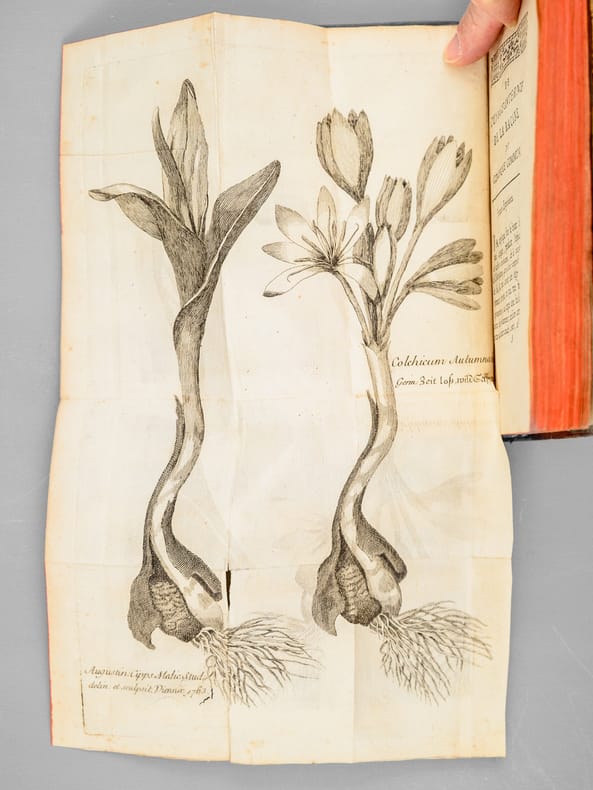 Rare exemplaire de l'édition originale de la traduction française du "Libellus, quo demonstratur : Colchici autumnalis radicem...". Médecin personnel de l'impératrice Marie-Thérèse, Anton von Störck (1731-1803) est célèbre pour ses études de pharmacognosie sur les plantes toxiques (ciguë, colchique, datura etc.). Il est fameux pour avoir mené sur l'animal mais aussi sur lui-même des expériences testant la limite entre les doses thérapeutiques, toxiques et létales. Un carton avec page de titre a été inséré (feuillet *D) au début de la seconde partie : "Observations de Monsieur Locher, Sur les Maladies vénériennes, l'Epilepsie, la Folie ; & sur l'usage interne & externe de la Ciguë. On y a joint des Observations de M. de Haen ; de Mrs Razoux & Videmar". Etat très satisfaisant (bonne restauration anciene en plats, petite usure en coiffe sup., fente en pliure à la planche dépliante)