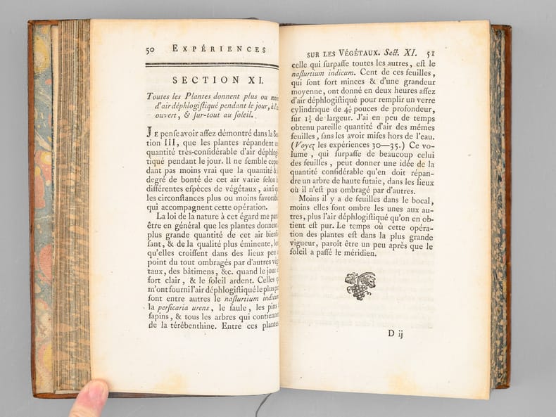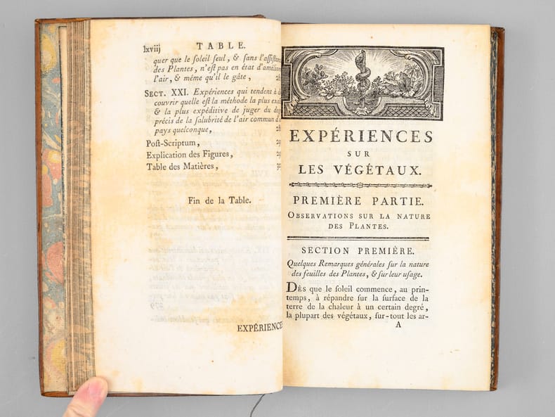 Edition originale de la traduction française de "Experiments on vegetables" du botaniste britannique Jan Ingenhousz (1730-1799), paru à Londre en 1779 et dans lequel il révèle et découvre le rôle de la lumière dans la photosynthèse. "Ingen-Housz showed that the green parts of plants, when exposed to light, fix the free carbon dioxide of the atmosphere, but that in darkness plants have no such power. Thus he proved that animal life is dependent ultimately on plant life [...]". Bon état (dos lég. frotté). DSB VII, 11 ; Garrison & Morton, 103