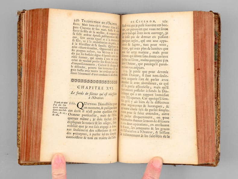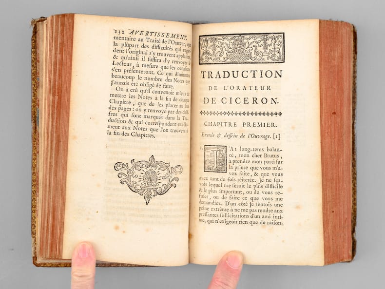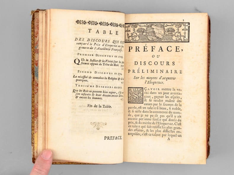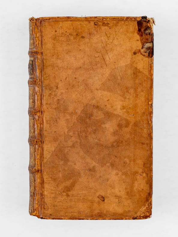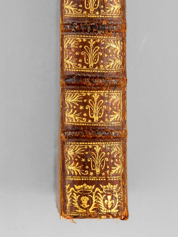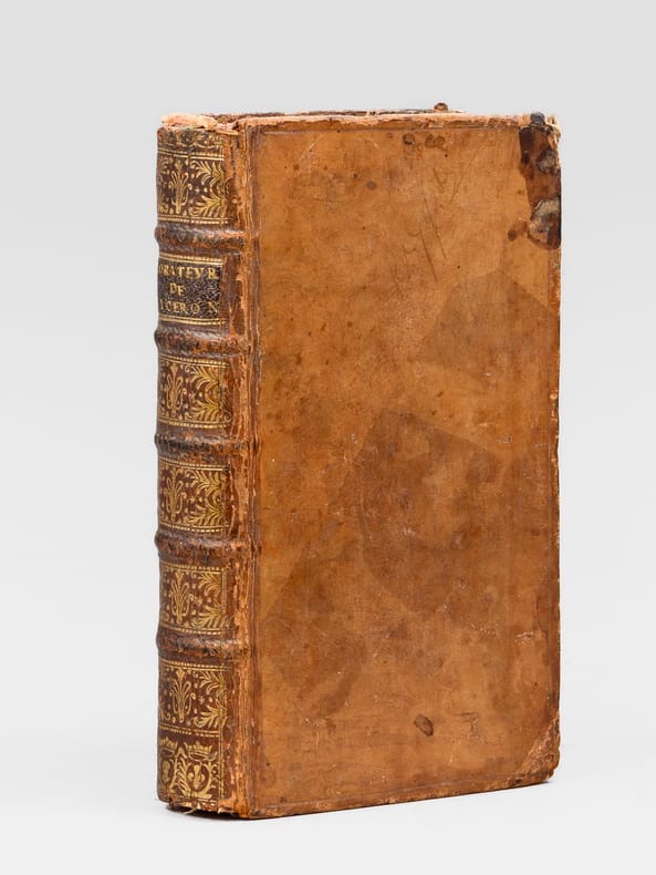 1 vol. in-12 reliure de l'époque plein veau brun, dos à 5 nerfs orné, roulette aux armes au dos en queue (mascaron couronné et lys couronné, chacuns entourés de palmes), Chez De Bure, Paris, 1737, 8 ff., 498 pp. et 3 ff. n. ch.