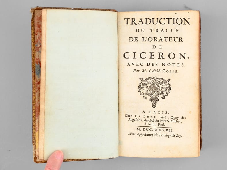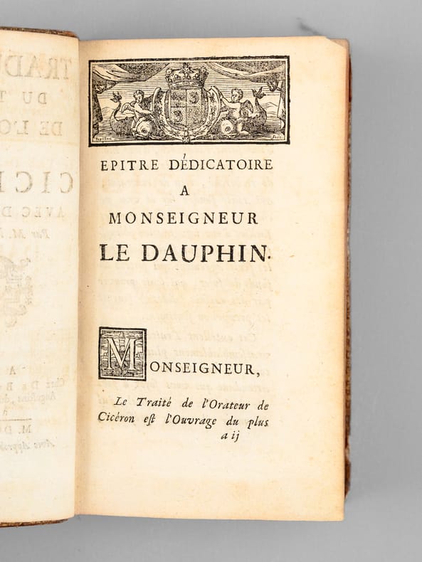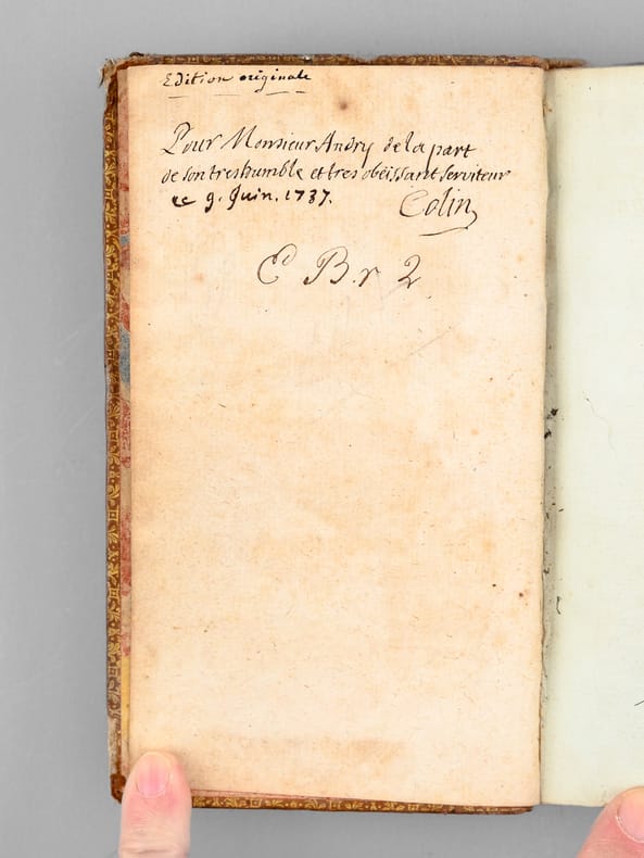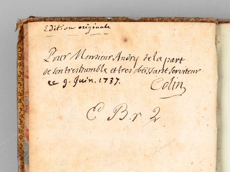 Remarquable exemplaire, dédicacé par l'Abbé Hyacinthe Colin "Pour Monsieur Andry, de la part de son très humble et très obéissant serviteur" et daté d'une autre plume "ce 9 juin 1737". Le dédicataire est probablement Nicolas Andry de Bois-Regard (1658-1742), fameux médecin doyen de la Faculté de Paris, et homme de lettres puissant et redouté, qui avait commencé son oeuvre par une traduction du latin, le Panégyrique de l'empereur Théodose du Bordelais Drepanius Pacatus. Critique littéraire influent, il était un pilier du "Journal des Savants" et est l'inventeur du mot "orthopédie". L'Abbé Hyacinthe Colin (1690-1745), latiniste distingué, fut un traducteur réputé. L'exemplaire est orné d'une jolie roulette aux armes au dos en queue (mascaron et lys couronnés, chacuns entourés de palmes). Etat satisfaisant (coiffes arasées, coupes frottées, bon état par ailleurs).