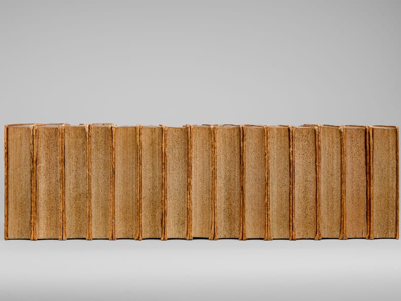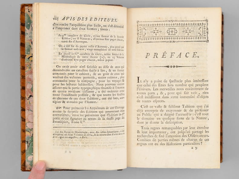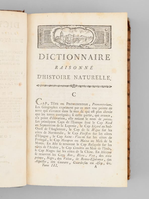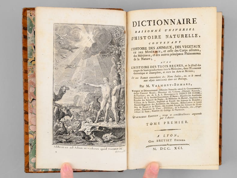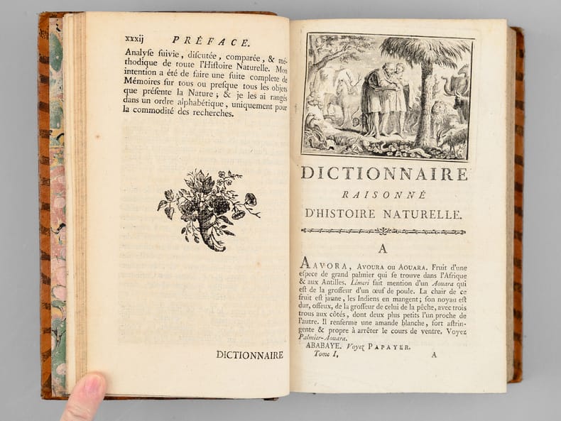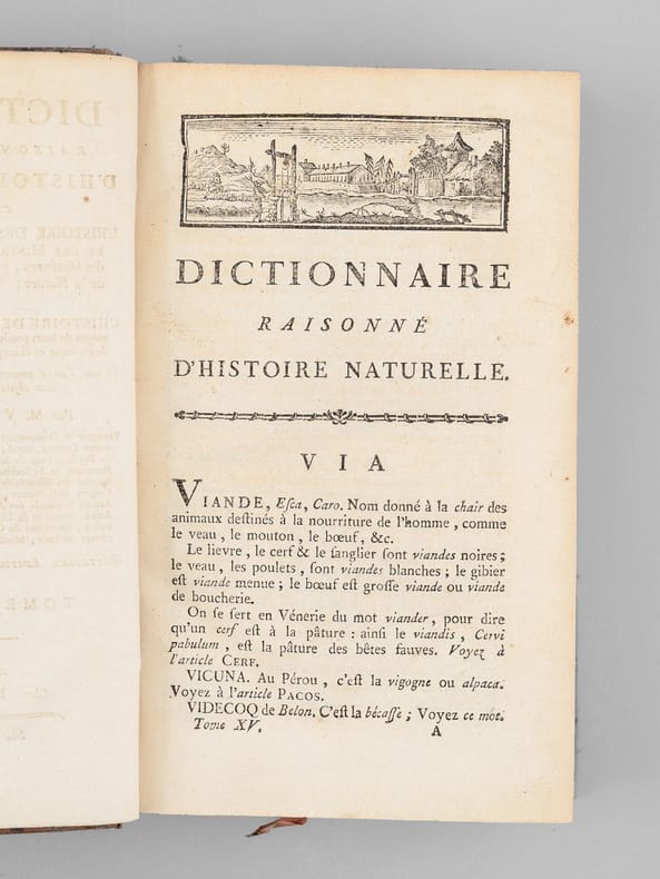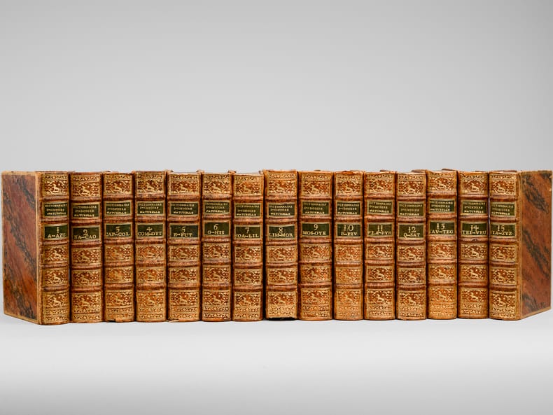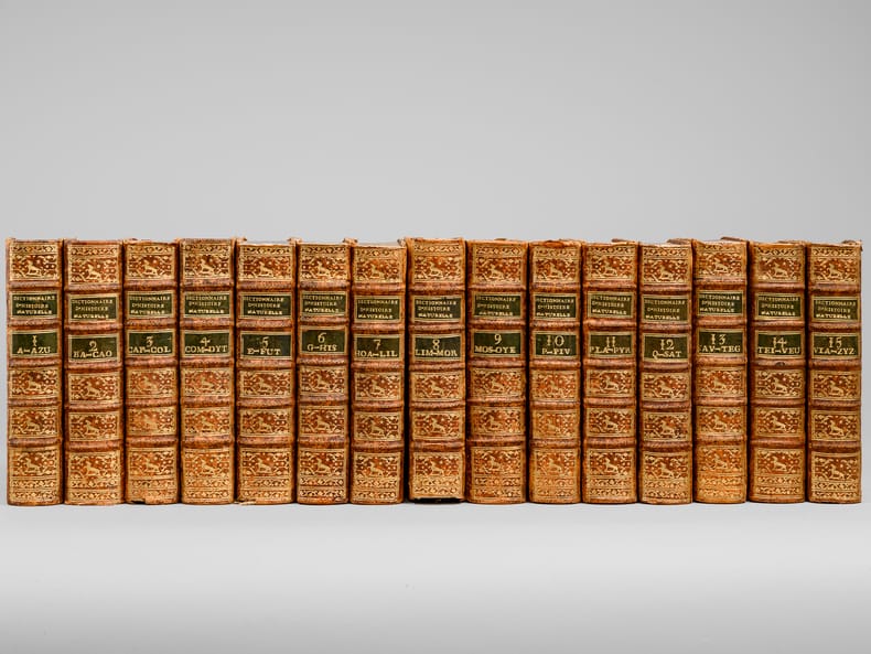 Et une Table concordante des Noms Latins, etc. et le renvoi aux objets mentionnés dans cet Ouvrage, Quatrième édition revue et considérablement augmentée par l'Auteur, 15 vol. in-8 reliure de l'époque pleine basane porphyre, dos à 5 nerfs orné (chien passant surmonté d'une étoile), triple filet doré d'encadrement en plats, filet doré en coupes, Chez Bruyset Frères, Lyon, 1791, frontispice dans le tome I, environ 600 pp. par volume. Rappel du titre complet : Dictionnaire Raisonné Universel d'Histoire Naturelle (15 Tomes - Complet) Contenant l'Histoire des Animaux, des Végétaux et des Minéraux, et celle des Corps Célestes, des Météores, et des autres principaux Phénomènes de la Nature ; Avec l'Histoire des Trois Regnes, et le détail des usages de leurs productions dans la Médecine, dans l'Economie domestique et champêtre, et dans les Arts et Métiers