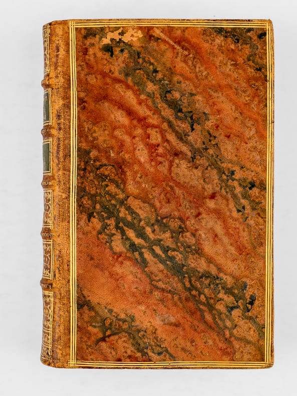 Le motif du petit fer répété en dos, celui d'un chien à l'arrêt (lévrier passant) surmonté d'une étoile est assez singulier et remarquable. Etat très satisfaisant (accrocs avec mq. en coiffes, coupes un peu frottées, bon état par ailleurs).