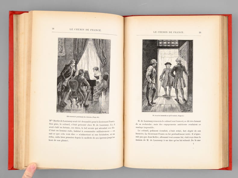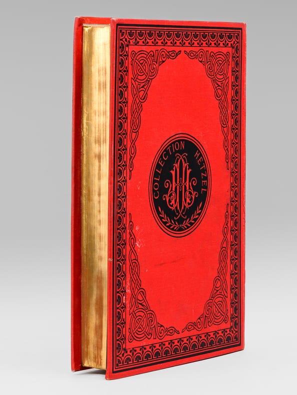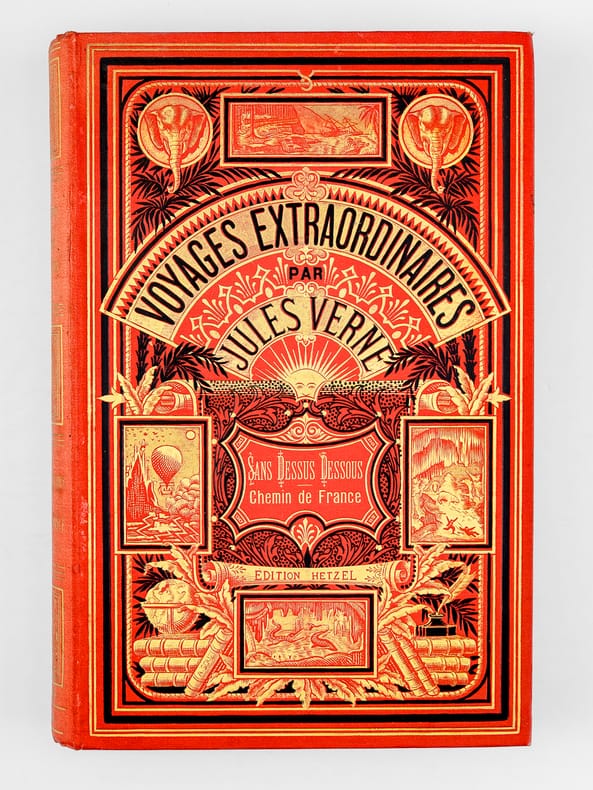 1 vol. grand in-8 cartonnage éditeur pleine percaline rouge aux deux éléphants, titre dans le cartouche, toutes tranches dorées, cartonnage signé A. Lenègre et Cie du 3ème type ((mention Hetzel sous le cartouche, médaillon circulaire à motifs noirs au plat inférieur), Bibliothèque d'Education et de Récréation, J. Hetzel et Cie, Paris, s.d. [1889 ], 4 ff., 204 pp., 2 ff., 220 pp. et 4 ff. (catalogue EX)