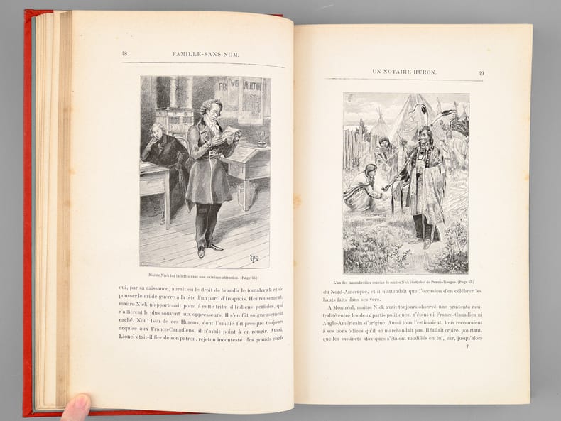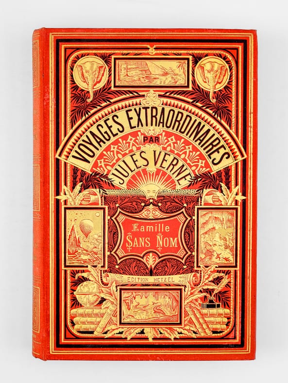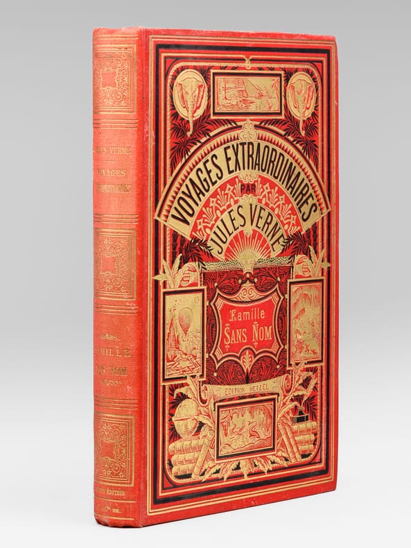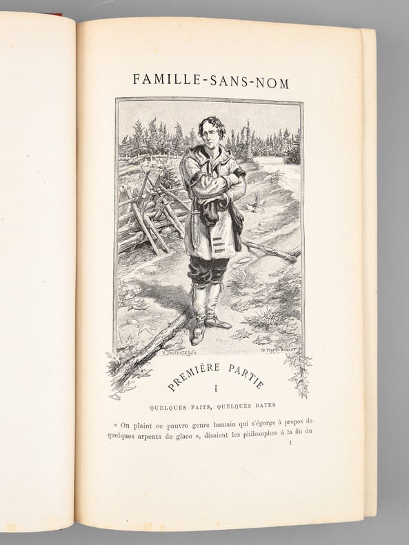 Première édition illustrée de 82 dessins de Tiret-Bognet, et une carte en couleurs du cours du Saint-Laurent. Catalogue EX in fine pour 1890. Cartonnage aux 2 éléphants de type Lenègre 3. Second plat de type Lenègre e. Ce cartonnage n'a connu que la couleur rouge. Quelques rousseurs éparses sur un papier bien blanc. Cette édition porte une étiquette ajoutée sur le cartouge corrigé, Une famille sans nom, devenant Famille sans nom avec la nouvelle étiquette. Belle plaque supérieure, aux ors bien nets. Coins bien pointus et rigides. Tranches dorées régulières. Dos uniformément insolé mais aux ors bien présents. Coiffes légèrement repliées. Beau second plat, sans défaut. Percaline brillante. Bel exemplaire, bien ferme et solidaire. Histoire d'une famille française du Canada pendant la rébellion des Patriotes (1837-1838) contre l'injustice britannique. Un des titres les plus graves de l'auteur, sans fin heureuse. - Photographies et détails sur www.Edition-Originale.com -