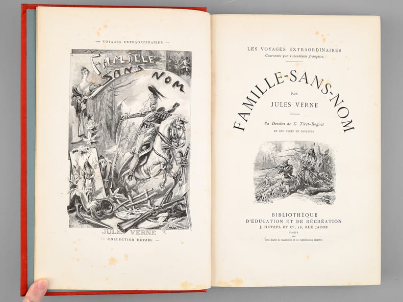 Première édition illustrée de 82 dessins de Tiret-Bognet, et une carte en couleurs du cours du Saint-Laurent. Catalogue EX in fine pour 1890. Cartonnage aux 2 éléphants de type Lenègre 3. Second plat de type Lenègre e. Plat supérieur avec de légers manques aux filets dorés, très discrètes épidermures sur le second plat, rousseurs. Ex-libris encollé en partie supérieure du contreplat. Verne narre dans Famille sans noml'histoire d'une famille française du Canada pendant la rébellion des Patriotes (1837-1838) contre l'injustice britannique. - Photographies et détails sur www.Edition-Originale.com -