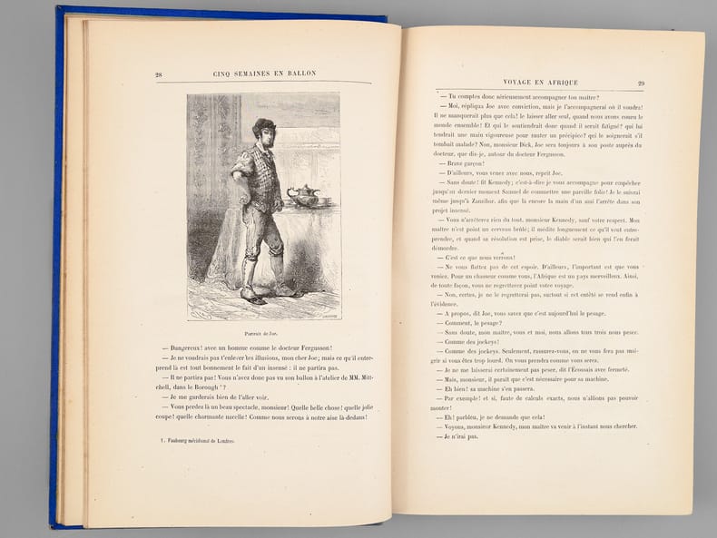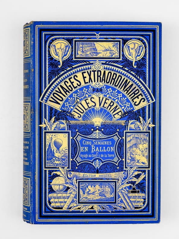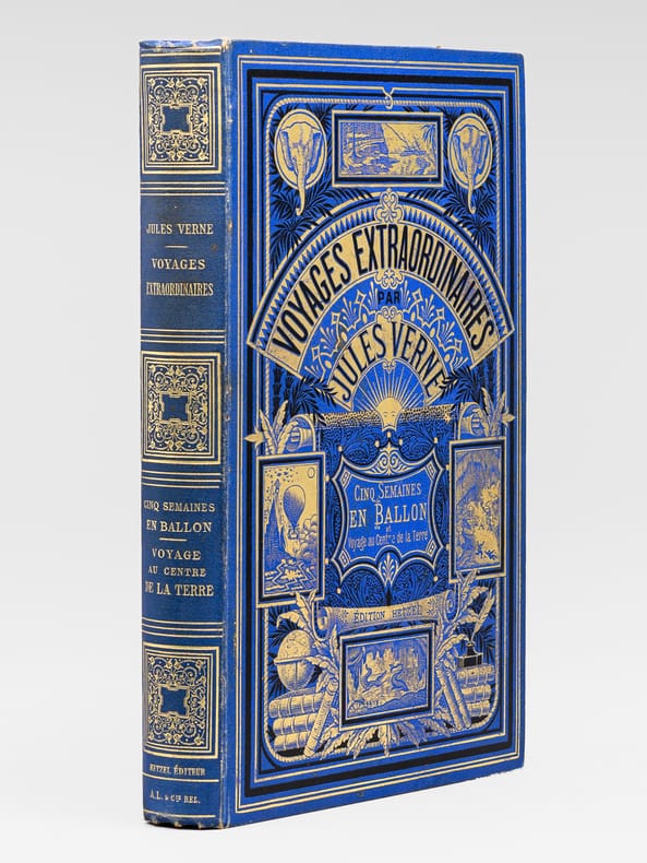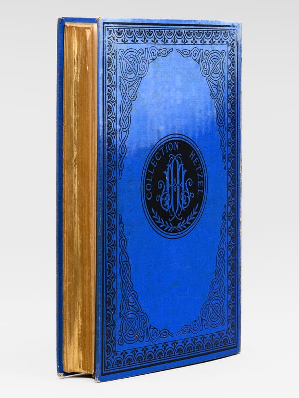 1 vol. grand in-8 cartonnage éditeur pleine percaline bleue aux deux éléphants, titre dans le cartouche, toutes tranches dorées, cartonnage signé A. Lenègre et Cie du 3ème type ((mention Hetzel sous le cartouche, médaillon circulaire à motifs noirs au plat inférieur), Bibliothèque d'Education et de Récréation, J. Hetzel et Cie, Paris, s.d. [1886-1887 ], 2 ff., 267 pp., 2 ff., 220 pp., et 6 ff. (catalogue DF)