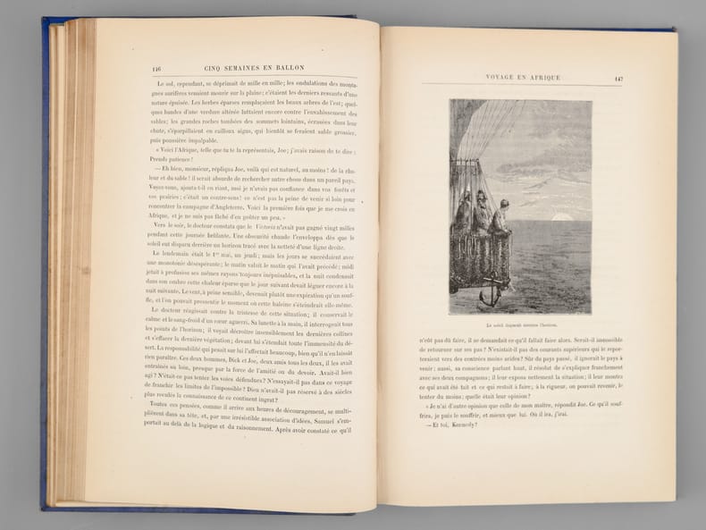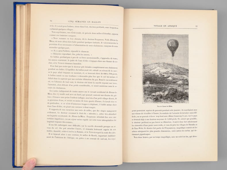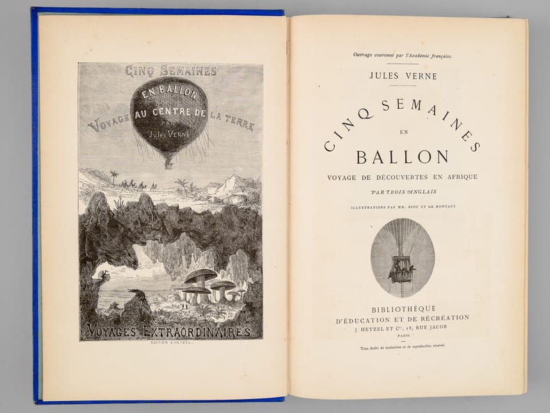Paris, J. Hetzel et Cie, Bibliothèque d'éducation et de récréation, sd, circa 1886, in-4, cartonnage éditeur rouge, 267 & 220p. Ce cartonnage particulier est issu du rachat par Girard et Boitte des stocks de ce titre soldé par Hetzel avec réutilisation du plat de Lenègre à l'obus : premier plat avec l'indication "Girard et Boitte" sous l'indication "Collection Hetzel" en lieu et place du titre. Le second plat est spécifique à cette édition, avec encadrement et cartouche rectangulaire estampés à froid. Gardes grises. Décor du premier plat passé, marque de mouillures dans le filet d'encadrement, sous le ballon et le steamer. Un cahier ressorti p54.