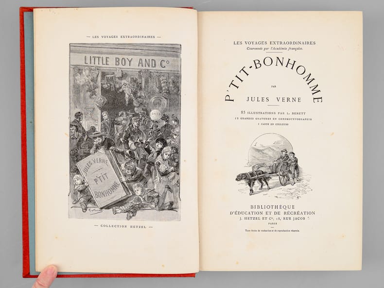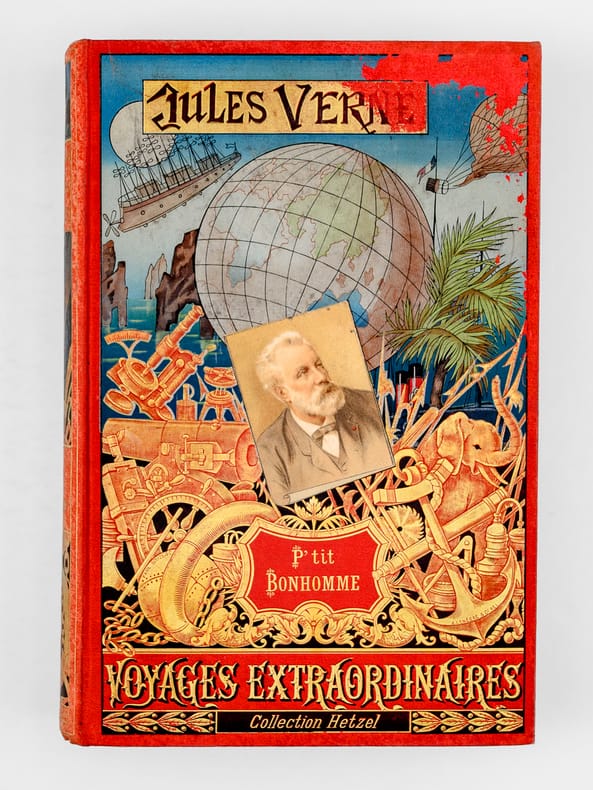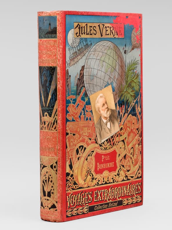 1891-1895, Hetzel, Bibliothèque d'éducation et de récréation, édition originale, in-4 percaline rouge de 460 pages, cartonnage au portrait et dos au phare, tranches dorées, Les voyages extraordinaires - P 'tit-bonhomme, 85 illustrations par L. Bennett, 12 grandes gravures en chromotypogaphie, 1 carte en couleurs | Etat : état moyen, couverture défraîchie, coins et coiffes frottés, rousseurs (Ref.: J12248)