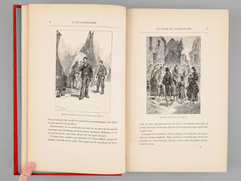 Edition illustrée de dessins de L. Benett ainsi que de grandes gravures en chromotypographie et d'une carte. Cartonnage éditeur Hetzel "à l'éventail et à l'éléphant" en pleine percaline rouge, premier plat polychrome signé Engel, second plat de type "i" comme indiqué par Jauzac, dos au phare, pages de garde bleues d'origines, toutes tranches dorées. Gardes bleues d'origine imperceptiblement et marginalement ombrées comme habituellement, coiffes légèrement affaissées sans gravité. Roman inspiré de Dickens,P'tit bonhommese déroule en Irlande et conte la vie et les aventures d'un orphelin. Bel exemplaire. - Photographies et détails sur www.Edition-Originale.com -