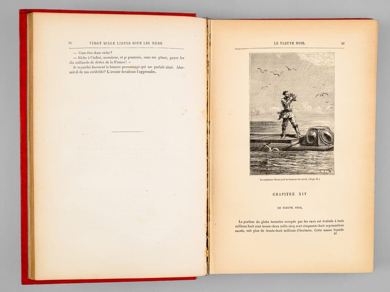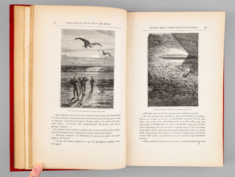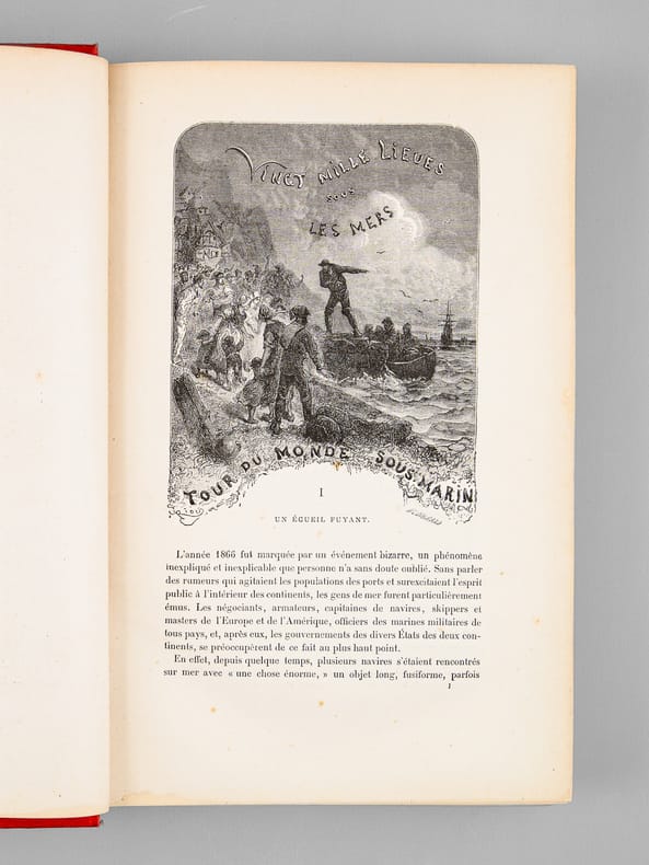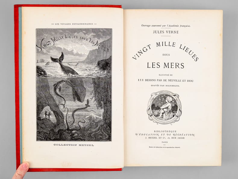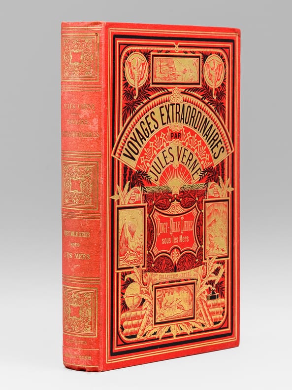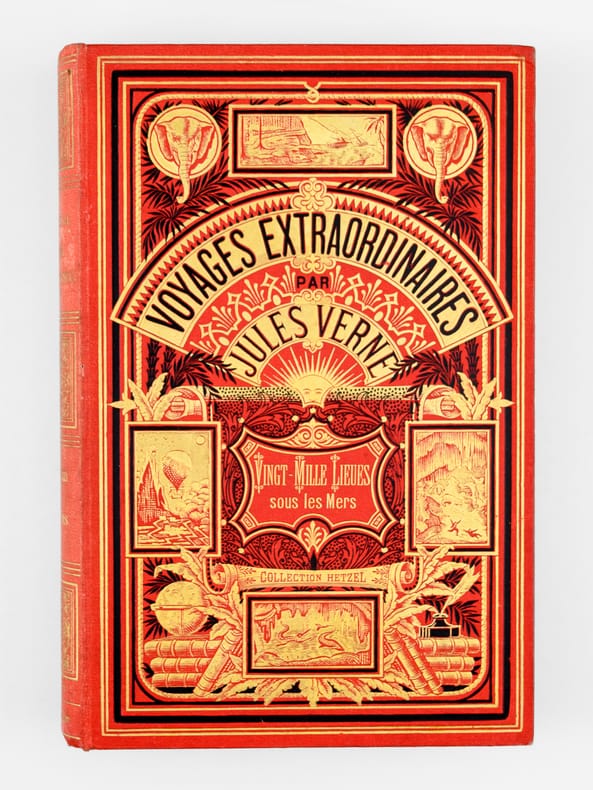Nouvelle édition illustrée de 111 dessins par De Neuville et Riou et gravés par Panemaker. Six planches hors-texte en polychromie ou monochromie. 2 planches en couleurs. Catalogue HF in-fine présentant quelques rousseurs. Cartonnage dit "Au portrait collé" polychrome et doré, avec la vignette sépia du portrait de Jules Verne. Plaque signée Paul Souze. A. Lenègre relieur. Dos au phare. Second plat de type Lenègre e. Vingt mille lieues sous les mers fut conçuà la suite d'une suggestion épistolaire deGeorge Sand, amie d'Hetzel, qui avait fort appréciéCinq semaines en ballonetVoyage au centre de la Terre. Ce titre mythique de la production du romancier générera de très nombreuses adaptations au cinéma, dont la première par Mélies en 1907, et la plus célèbre en 1954 par Richard Fleisher. Exemplaire d'une exceptionnelle fraîcheur d'un des chefs-d'oeuvre de Jules Verne. - Photographies et détails sur www.Edition-Originale.com -