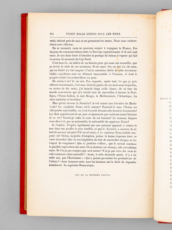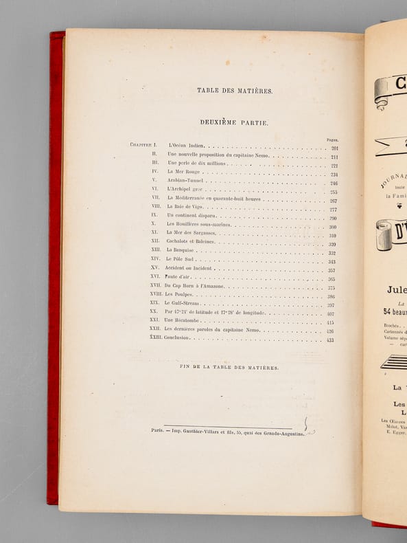 Vingt Mille Lieues sous les mers en 2 Volumes. Collection Hezel, nouvelle édition. Imprimerie Belin Frères. Reliure rouge, filets dorés, titre doré et incrustations dorées et liseret noir sur le dos; Incrustations d'une pièce de titre dorée sur le premier plat et de liserets noirs sur le premier et dernier plat. Tranche dorée. Les deux volumes sont en bon état. Première partie 336 pages. Deuxième partie 357 pages. , Édition: Collection Hetzel, Bon État,