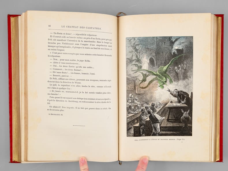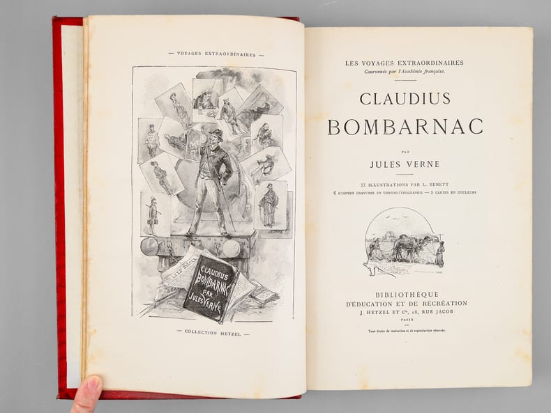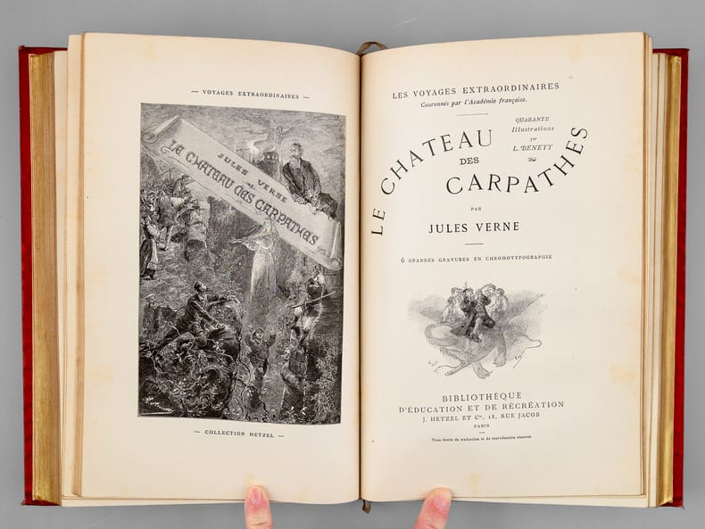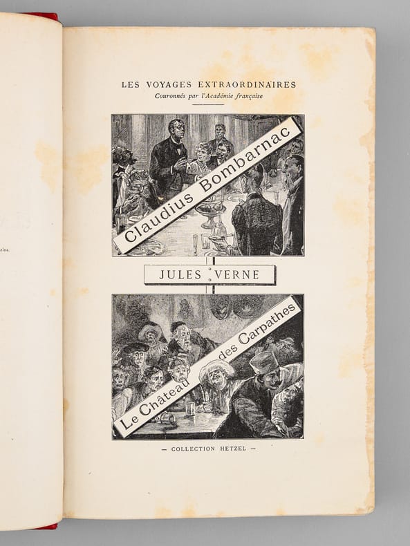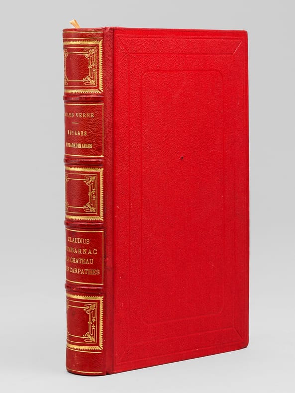 Les voyages extraordinaires. 2 ouvrages en 1 volume.Claudius Bombarnac. 55 illustrations par L. Benett. 6 grandes gravures en chromotypographie - 2 cartes en couleurs.Le Chateau des Carpathes. 40 illustrations par L. Benett. 6 grandes gravures en chromotypographie.Édition originale. Paris, Bibliothèque d'Education et de Récréation J. Hetzel et Cie. 1892 - 285 et 199 pp + catalogue GK 1892-1893. Relieur Lenègre. Imprimeur Gauthier-Villars.Cartonnage Hetzel rouge au portrait collé. Dos au phare. Tranches dorées. Gouttière régulière. Très rares rousseurs. Bon état. Format in-4°(28x19).