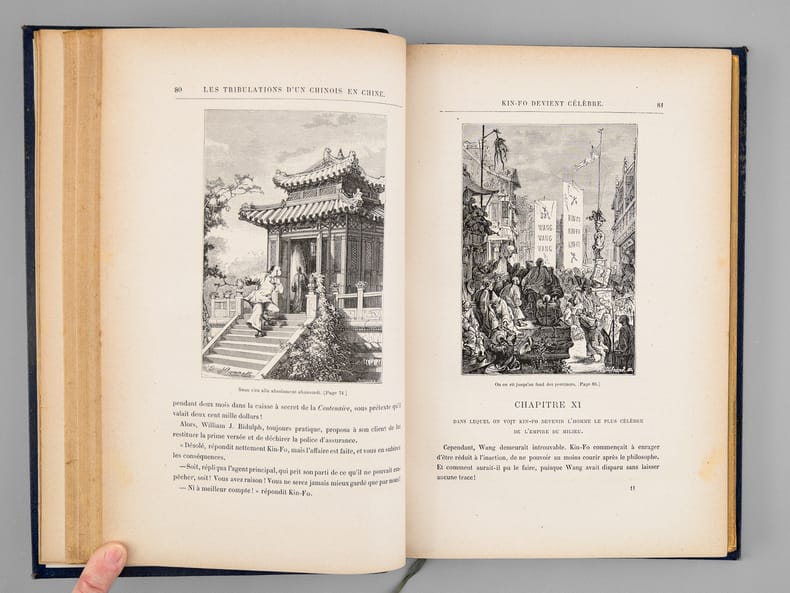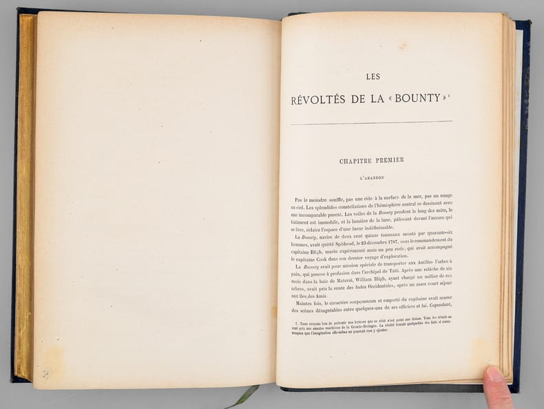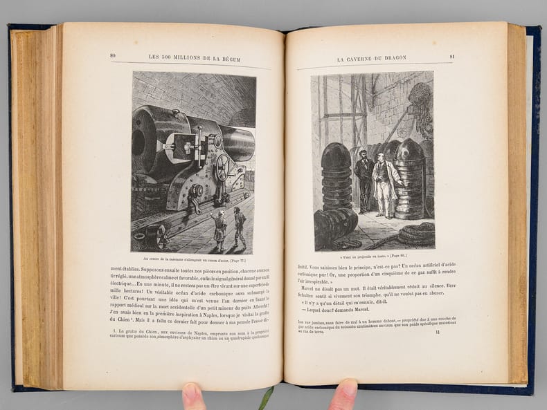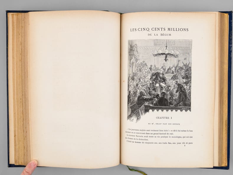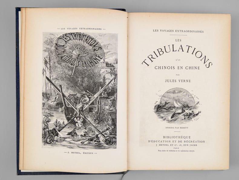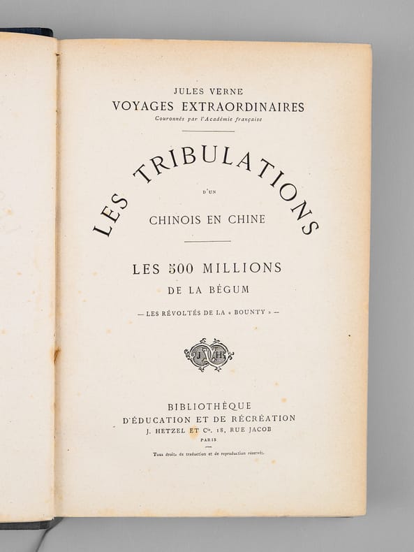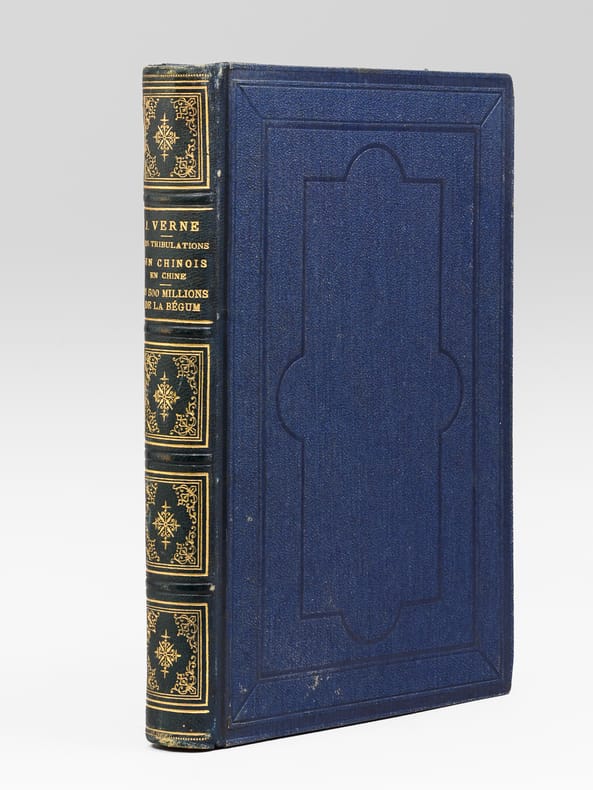 1 vol. in-8 reliure de l'époque demi-chagrin bleu, dos à 4 nerfs orné, toutes tranches dorées, Collection Hetzel, Coll. Les Voyages Extraordinaires, Bibliothèque d'Education et de Récréation, J. Hetzel et Cie, Paris, s.d., 2 ff., 203 pp., 2 ff., 185 pp. et 1 f. n. ch.