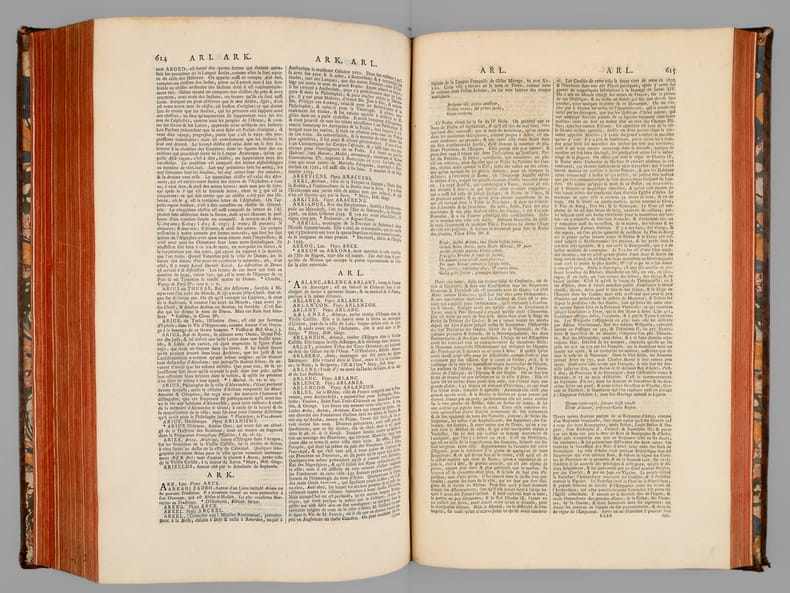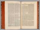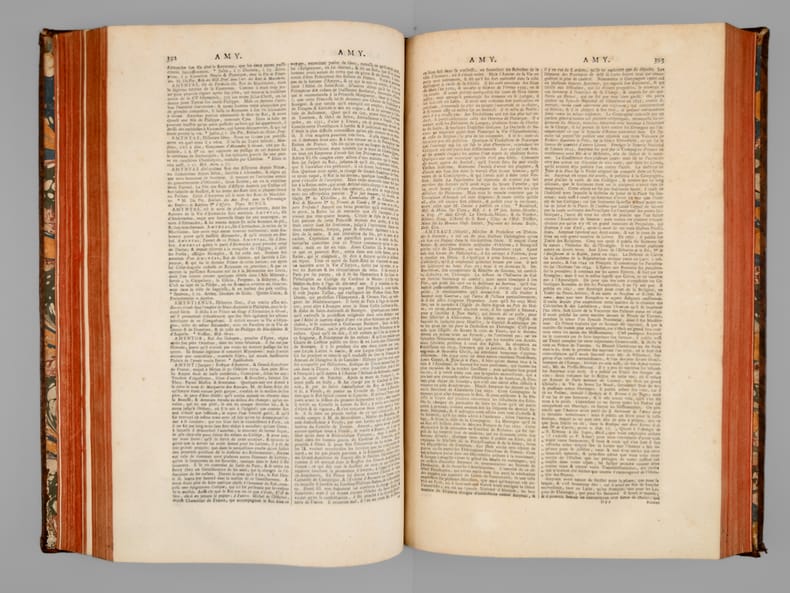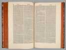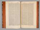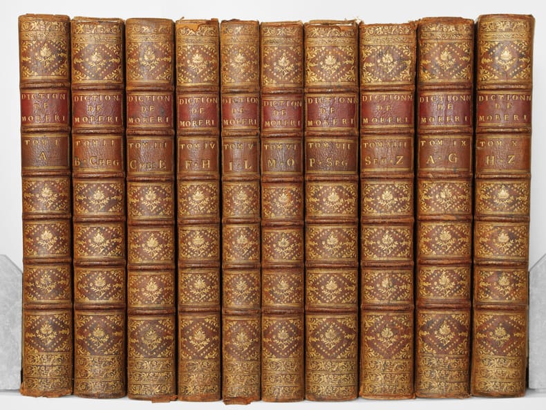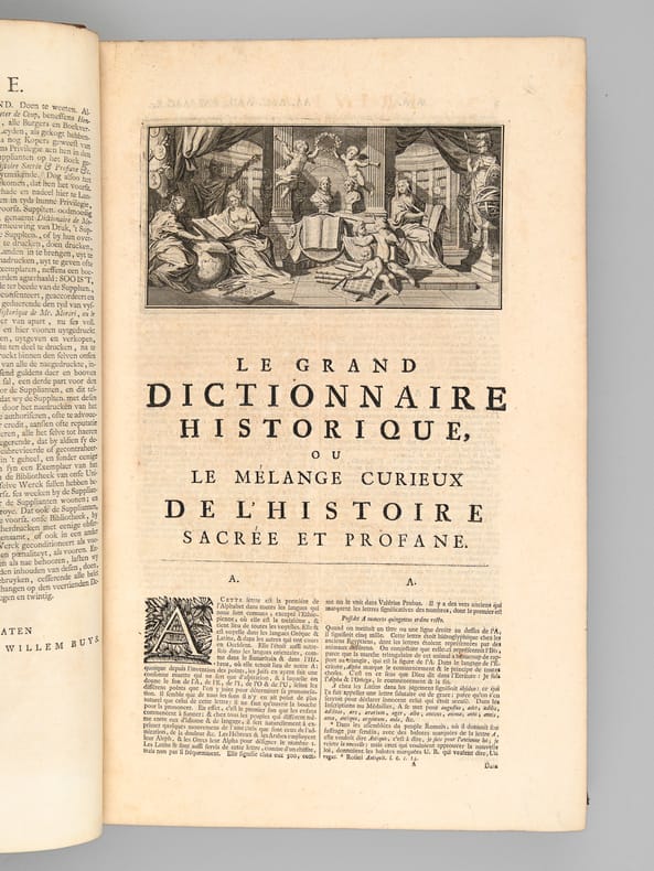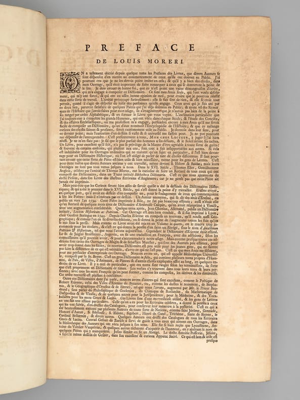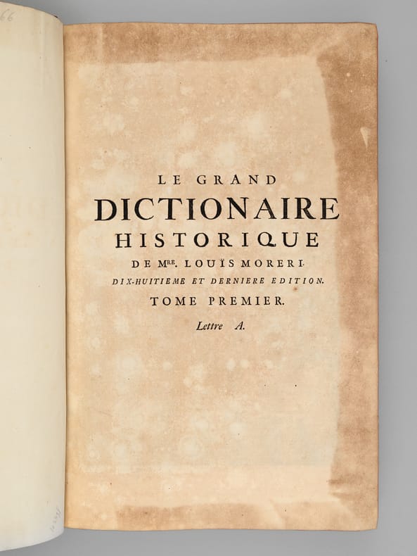 A propos du Dictionnaire de Morery, nous citerons Pierre Larousse en préface de son Grand Dictionnaire : "Les étrangers ont plusieurs fois imités ce savant ouvrage, qui a été traduit en allemand, en anglais, en espagnol et en italien. Aujourd'hui encore, c'est une mine où les encyclopédistes puisent chaque jour à pleines mains ; la source est véritablement inépuisable, et le "placer" est si riche qu'on y trouve à chaque pas des pépites précieuses qui n'avaient pas encore été remarquées. On peut, sans exagération, comparer le Dictionnaire de Moréri à ces monuments de l'antiquité dont les ruines ont enrichi tous les musées, et où, cependant, les derniers venus trouvent toujours quelques débris de chef-d'oeuvre à emporter". Cet exemplaire de la dix-huitième édition est complété des deux volumes de supplément, parus en 1749, l'ensemble étant établi en reliure uniforme. Bon ensemble (qq. mq. en coiffes, qq. usures en coins et ancienne restauration sur un plat, bon exemplaire par ailleurs).