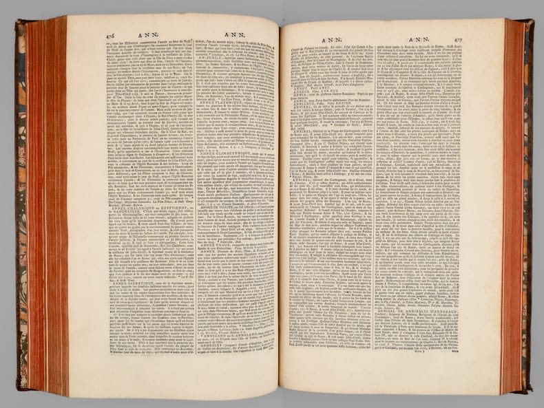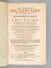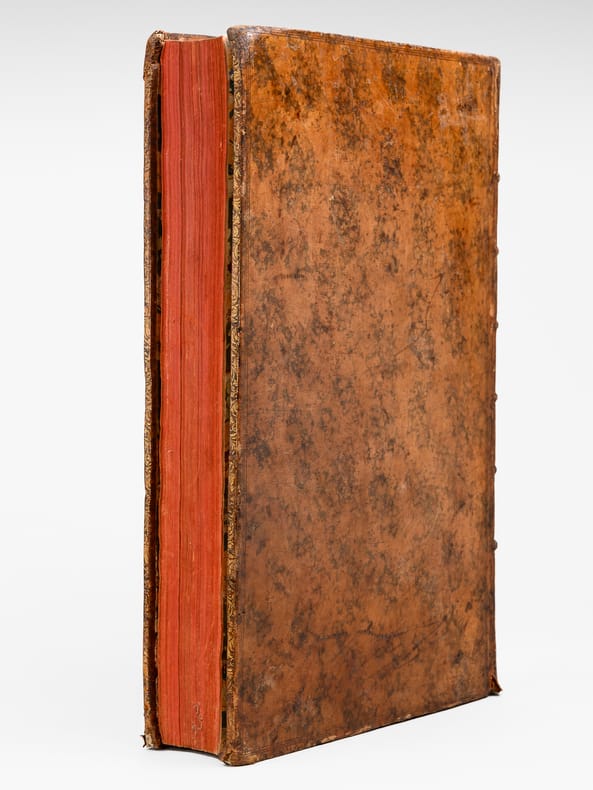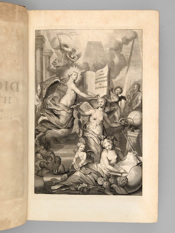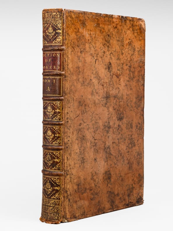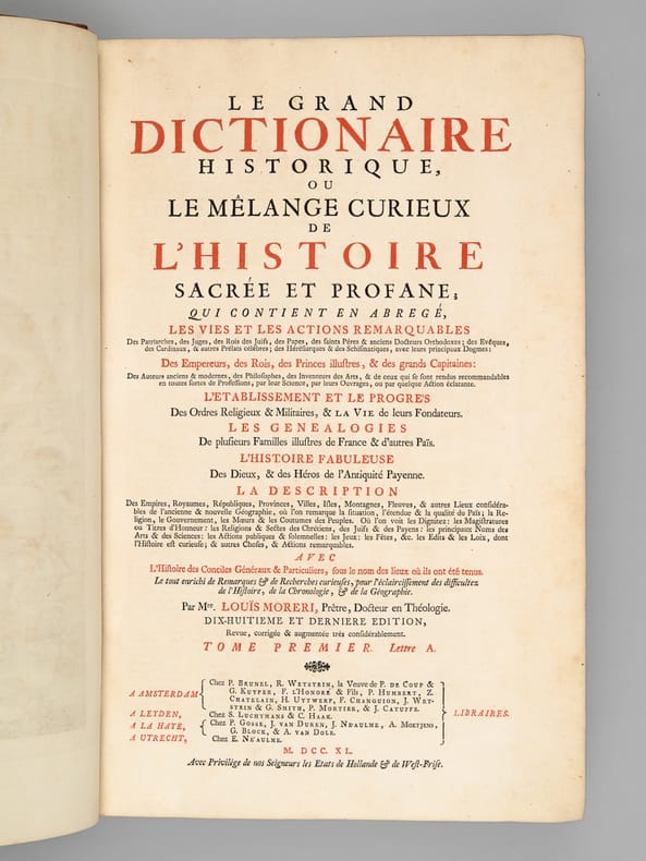 Dix-huitième et dernière édition, 10 vol. in-folio reliure de l'époque plein veau marbré, dos à 6 nerfs orné, Chez P. Brunel, R. Wetstein, la Veuve de P. de Coup [ ... ], Amsterdam, Chez S. Luchtmans & C. Haak, Leyden, Chez P. Gosse, J. Van Duren, [... ] La Haye, Chez E. Néaulme, Utrecht, 1740,avec frontispice gravé et Chez Jacques Vincent, J.B. Coignard & A. Boudet, P. G. Le Mercier, J. Desaint & Ch. Saillant, Jean-Thomas Hérissant, Paris, 1749 (Supplément) - Titre complet : Le Grand Dictionnaire Historique, ou Le Mélange Curieux de l'Histoire Sacrée et Profane Qui contient en abrégé les vies et les actions remarquables des Patriarches, des Juges, des Rois des Juifs, des Papes, des Saints Pères et anciens Docteurs orthodoxes, des Evêques, des Cardinaux, et autres Prélats célèbres, des Hérésiarques et des Schismatiques avec leurs principaux dogmes. Des Empereurs, des Rois, des Princes illustres et des grands Capitaines. Des auteurs anciens et modernes, des philosophes, des inventeurs des arts et de ceux qui se sont rendus recommandables en toutes sortes de professions, par leur science, par leurs ouvrages ou par quelque action éclatante. L'établissement et le progrès des ordres religieux et militaire et la vie de leurs fondateurs, les Généalogies de plusieurs Familles illustres de France & d'autres Païs. L'histoire fabuleuse des Dieux et des Héros de l'Antiquité Payenne. La descriptions des Empires, Royaumes, Républiques, Provinces, Villes, Isles, Montagnes, Fleuves et autres lieux considérables de l'ancienne et nouvelle géographie, ou l'on remarque la situation, l'étendue et la qualité du pais, la religion, le gouvernement, les moeur et les coutûmes des peuples. Ou l'on voit les dignités : Les magistratures ou titres d'honneur. Les religions et sectes des Chrétiens, des Juifs et des payens. Les principaux noms des arts et des sciences. Les actions pbliques et solemnelles. Les jeux. Les fêtes et les Edits et les Lois, dont l'histoire est curieuse et autres choses et actions remarquables avec l'histoire des Conciles Généraux et Particuliers, sous le nom des lieux ou ils ont été tenus. Le tout enrichi de remarques et de recherches curieuses, pour l'eclaircissement des difficultés de l'Histoire, de la Chronologie et de la Géographie [ Suivi de : ] Nouveau Supplément au Grand Dictionnaire Historique, Généalogique, Géographique, &c. de M. Louis Moreri, pour servir à la dernière Edition de 1732 & aux précédentes.
