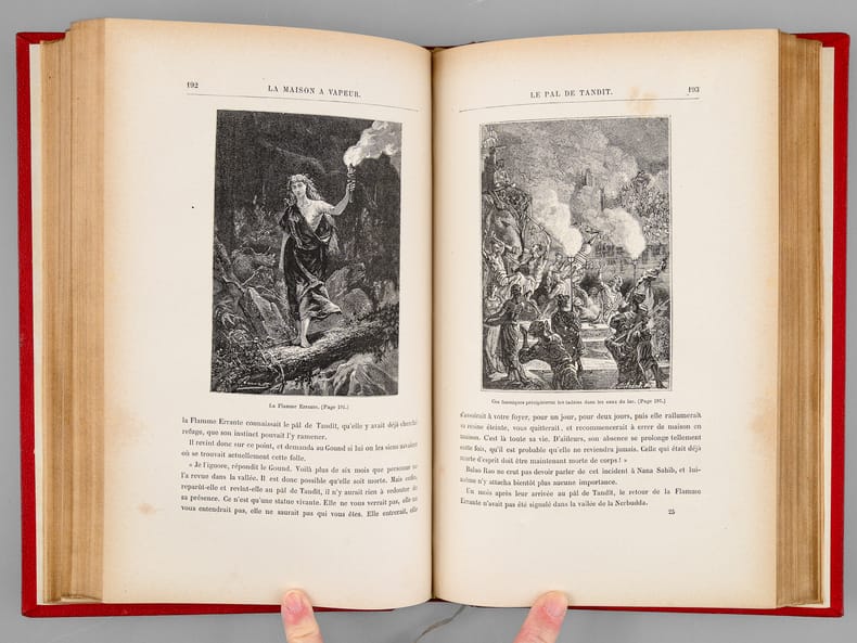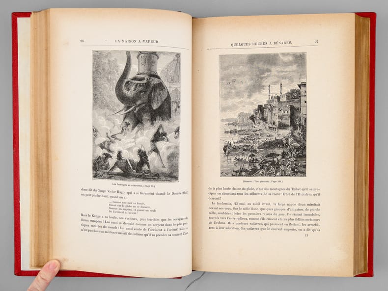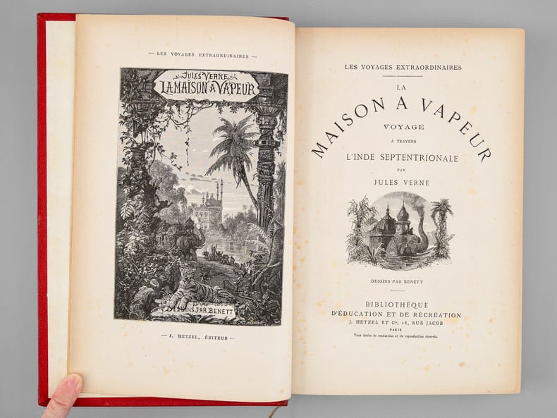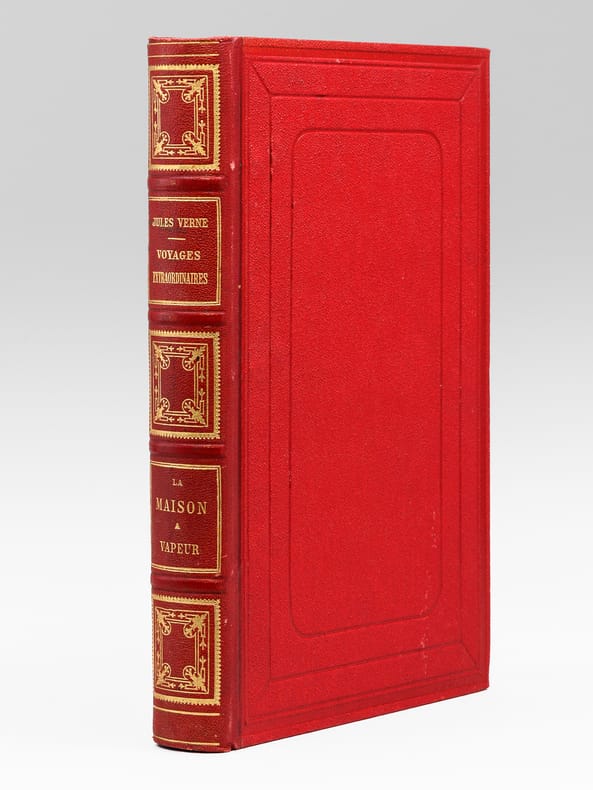 Première édition illustrée de 101 dessins par Benett dont un frontispice gravé par Meaulle et 2 cartes pleine page. Catalogue AI pour l'année 1881. Cartonnage rouge aux deux éléphants, second plat de type Lenègre b, au macaron à froid, conforme à la description de Jauzac. Volume très légèrement gauchis, une petite trace noire au niveau de la coupe inférieure du second plat Roman d'aventure et d'anticipation ayant pour cadre l'Inde. La maison à vapeur est une sorte de train dont la locomotive est un éléphant à vapeur, l'engin roule sans rail et peut même être amphibie. - Photographies et détails sur www.Edition-Originale.com -
