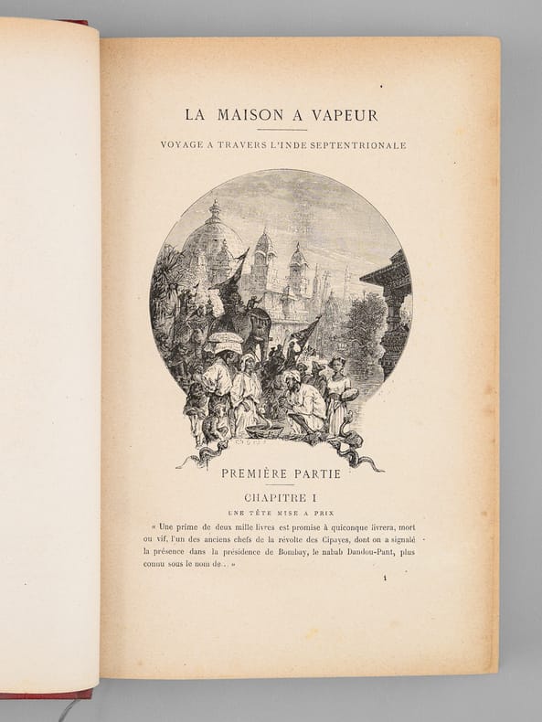 Première édition illustrée de 101 dessins par Benett dont un frontispice gravé par Meaulle, et 2 cartes pleine page. Catalogue GK in fine. Cartonnage polychrome dit "au portrait collé", un portrait de l'auteur prenant place dans un cartouche sur un plat à la mappemonde. Plaque signée paul Souze sur un boulet. A. Lenègre sur l'encre. Belle plaque supérieure avec quelques traces dans le haut du cartonnage. Les 2 coins bas un peu émoussés. Dos fané avec des ors estompés. Coiffe de tête affaissée. Second plat portant 3 fines rayures et des zones grattées le long du mors. Pâles brunissures sur la page de garde et le titre, ensuite rares brunissures. Roman d'aventure et d'anticipation ayant pour cadre l'Inde. La maison à vapeur est une sorte de train dont la locomotive est un éléphant à vapeur, l'engin roule sans rail et peut même être amphibie. - Photographies et détails sur www.Edition-Originale.com -