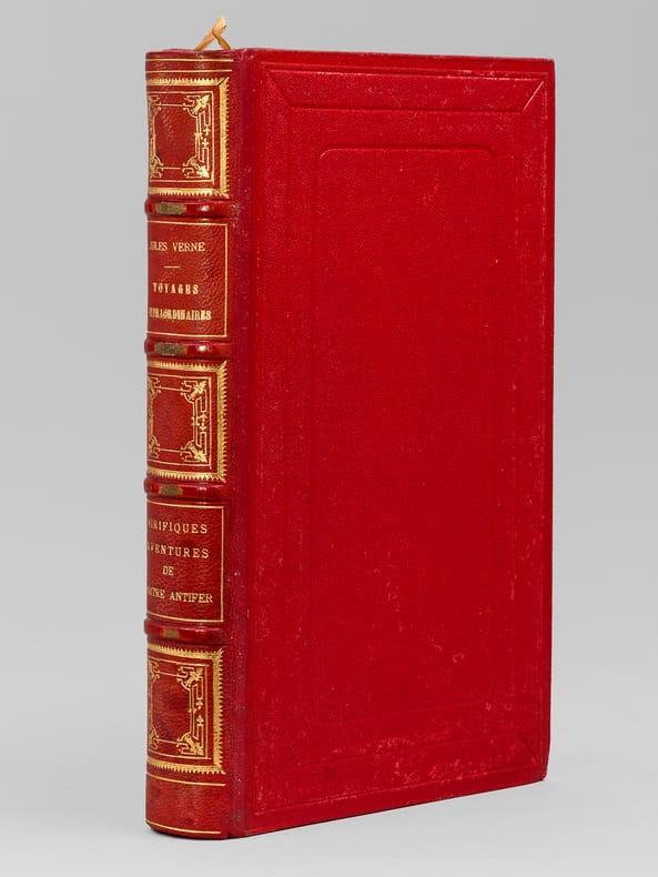 78 Illustrations par Georges Roux, 1 vol. in-8 reliure de l'époque demi-chagrin rouge dite « aux fers de lance » (ou « harpons » ou "reliure à la lancette"), dos à 4 nerfs orné, toutes tranches dorées, reliure signée de Wendling, Collection Hetzel, Coll. Les Voyages Extraordinaires, Bibliothèque d'Education et de Récréation, J. Hetzel et Cie, Paris, s.d., 2 ff., 438 pp.