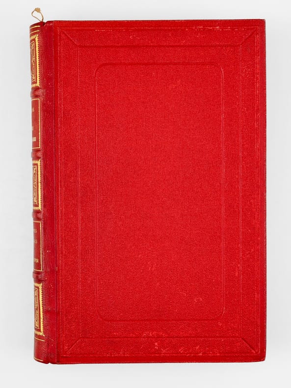Exemplaire en reliure du type "aux fers de lance" signée Wendling, en état très satisfaisant (petit frott. sur les 4 nerfs, rares rouss., très bon état par ailleurs). D'après la remarquable Gazette n° 8 de la Librairie Monte Cristo, cette production "Wendling" débutant sans doute vers 1900-1902 fut réalisée "à destination d'un marché encore inconnu de nous" et serait en réalité légèrement différente de la version classique "aux fers de lance" : les reliures Wendling font 27,5 cm de haut (contre 28,2 pour les Hetzel) et les caractères utilisés pour les fers sont différents (cf. : Librairie Monte Cristo, Gazette n°8, pp. 19-20)