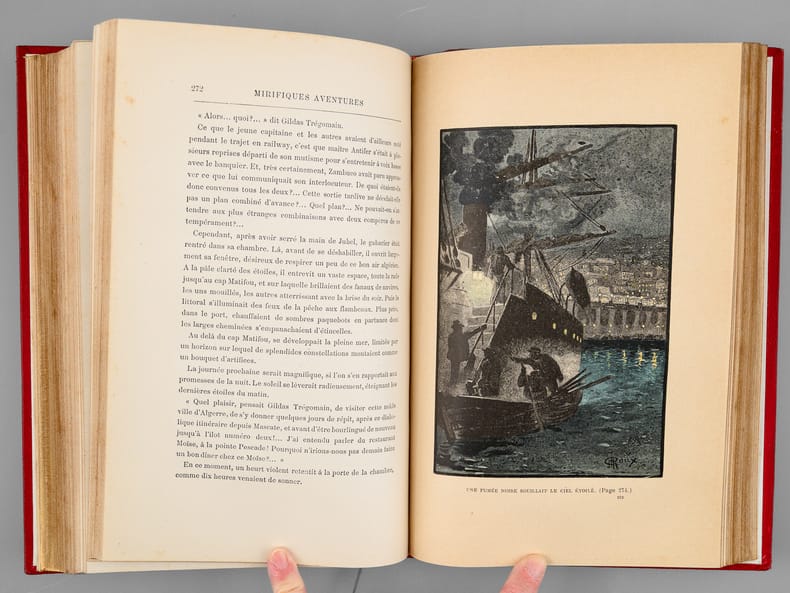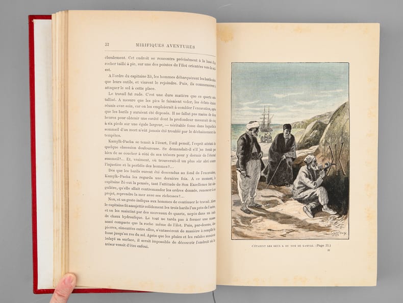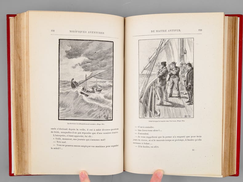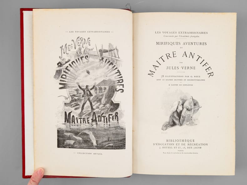 Mirifiques aventures de Maître Antifer mérite d'être examiné avant tout dans le contexte de la navigation astronomique. Comme Jules Verne l'a déclaré lui-même à un journaliste, « c'est l'histoire d'un chercheur et découvreur de trésor, et l'intrigue tourne autour d'un problème géométrique très curieux, » (Robert Sherard, 1894, in Entretiens avec Jules Verne, 1873-1905), dont le résolution permettrait de trouver trésor censé se trouver au pôle d'une calotte sphérique dont le cercle de base est déterminé par les positions de trois îlots, visités successivement par les personnages du roman. Le but ultime du voyage sera l'île Julia, un îlot volcanique qui disparaît sous les flots lorsque les héros s'y rendront. Comme souvent, Jules Verne s'empare du réel : l'île Julia a bel et bien existé, décrite ainsi par Pierre Larousse dans son Grand dictionnaire universel du XIXe siècle : « une petite île flottante qui parut en 1831, dans la Méditerranée, entre la Sicile et l'île de Puntellaria ; elle avait 700 mètres de circuit et 70 mètres au-dessus du niveau de la mer. Au bout d'un mois, elle s'enfonça dans les flots. En 1851, on remarqua qu'elle remontait. ». L'île est également mentionnée dans d'autres romans de Jules Verne : Les Enfants du capitaine Grant, Le Chancellor et Mathias Sandorf. Beau cartonnage au dos type F, 2e plat type N, avec catalogue HF, 1894-95. Minimes défauts en pied, quelques rousseurs. Bottin, 302-303.