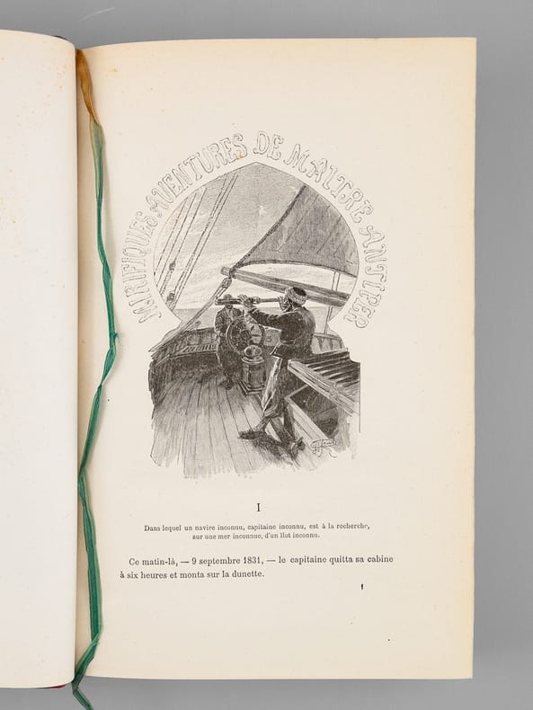 Première édition grand in-8 illustrée de planches en chromolithographie par George Roux. Cartonnage éditeur Hetzel "au portrait collé" en pleine percaline rouge signé A. Lenègre, premier plat polychrome signé Souze représentant divers moyens de locomotion (ballon, locomotive, bateaux), un portrait de l'auteur dans les tons sépias contrecollé au centre, divers instruments de navigation rehaussés à l'or au premier plan, second plat de type "e" comme indiqué par Jauzac, dos orné de plusieurs illustrations en couleur et à l'or, pages de garde bleues d'origines, toutes tranches dorées. Catalogue HF in-fine. Dos très légèrement éclairci et quelques piqûres éparses. Mors fendu en tête sur quelques centimètres du second plat. Aventures maritimes qui racontent une chasse au trésor, menant le héros de la Tunisie au golfe de Guinée, puis en Ecosse, à l'île de Spitzberg, et enfin en Sicile. - Photographies et détails sur www.Edition-Originale.com -