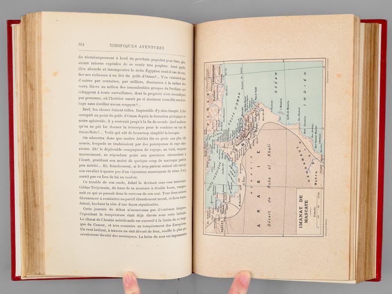 Première édition grand in-8 ornée de 78 illustrations ainsi que de 12 planches en chromotypographie par George Roux et de 2 cartes en couleurs. Cartonnage éditeur Hetzel "au portrait collé" en pleine percaline rouge signé A. Lenègre, premier plat polychrome signé Souze représentant divers moyens de locomotion (ballon, locomotive, bateaux), un portrait de l'auteur dans les tons sépias contrecollé au centre, divers instruments de navigation rehaussés à l'or au premier plan, second plat de type "e" comme indiqué par Jauzac, dos orné de plusieurs illustrations en couleur et à l'or, pages de garde bleues d'origines, un coin supérieur pincé, toutes tranches dorées. Catalogue HF in-fine. Quelques petites rousseurs. Aventures maritimes qui racontent une chasse au trésor, menant le héros de la Tunisie au golfe de Guinée, puis en Ecosse, à l'île de Spitzberg, et enfin en Sicile. - Photographies et détails sur www.Edition-Originale.com -